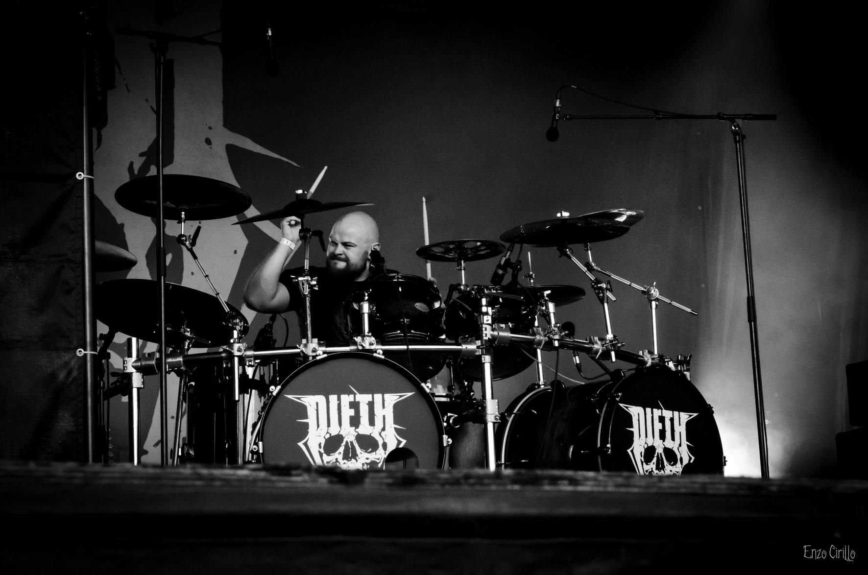C’est le moment de découvrir DIETH, le nouveau projet de David Effelson, ex-bassiste de MEGADETH. Musicalement, on est bien loin de la musique de ce dernier, ce qui prouve que David a plus d’un tour dans son sac. Et bien que la formation soit jeune, il y a là des musiciens expérimentés, David bien sûr mais aussi celui assure à la fois guitare et chant, le brésilien Guilherme Miranda, surtout connu pour avoir joué chez ENTOMBED A.D. de 2019 à 2021, et à la drum on retrouve le batteur Polonais Michał M. Łysejko, ex-DECAPITATED, et un guitariste de session, autant dire qu’Effelson s’est très bien entouré. Comme il l’a dit lui-même dans une interview, le groupe est à la croisée du Thrash et du Death, lui étant un trasheux et les autres étants plutôt orientés Death, c'est donc une collaboration Thrash/Death. DIETH a sorti son premier album To Hell and Black en juin dernier, une première pierre à l’édifice qui semble déjà bien tenir et au vu des réactions dans le pit, les bases vont se solidifier. DIETH rejoint ces groupes qui font une ascension fulgurante, pas seulement car c’est le projet d’un grand nom du metal, mais aussi car beaucoup de gens ont besoin de renouveau et d’ailleurs, ce projet est certainement comme une renaissance pour David Effelson.