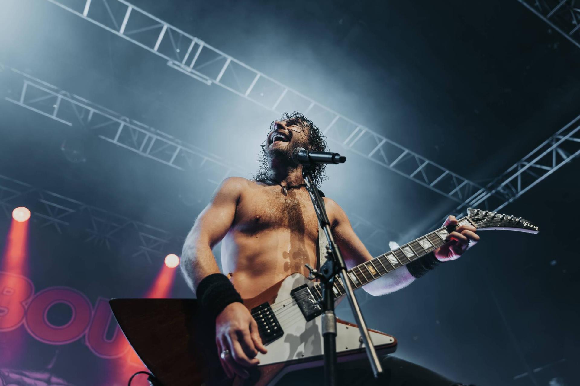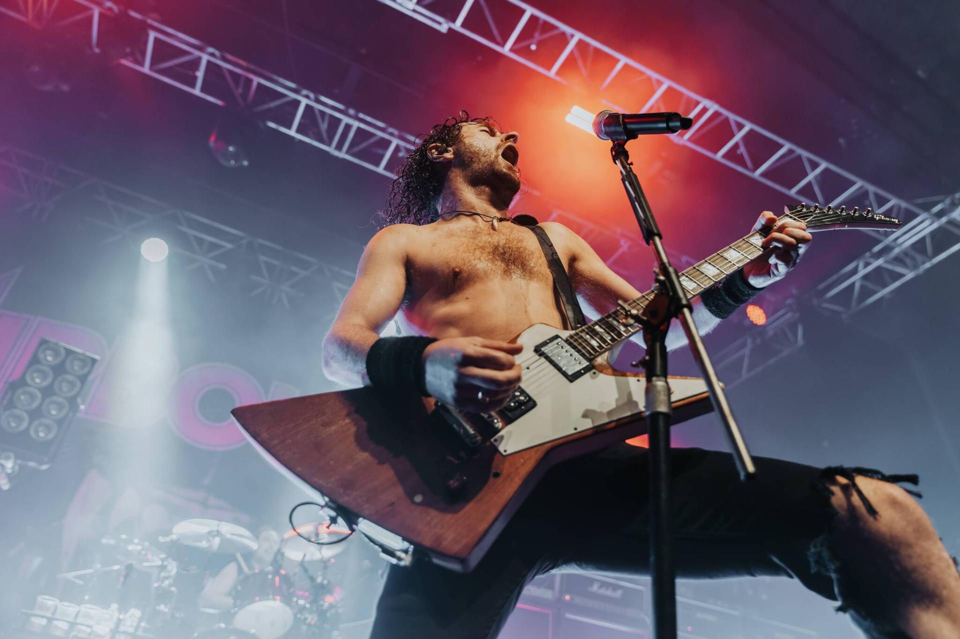 C’est sur la BO de Terminator 2 qu’AIRBOURNE a fait son entrée, et dès les premières secondes, l’ambiance était électrique. Deux rangées de huit énormes amplis, un jeu de lumières millimétré et une énergie brute : tout était réuni pour un show explosif. Dès les premières notes de Too Much, Too Young, Too Fast, la fosse s’est déchaînée, et les premiers slammers ont commencé à voler. Le public, dans lequel toutes les générations se côtoyaient, connaissait chaque morceau par cœur, montrant l’efficacité intemporelle du groupe.