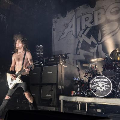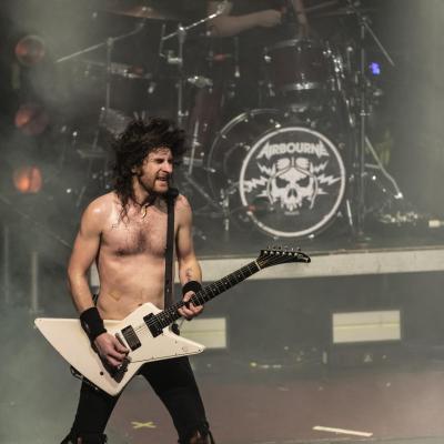 Les dernière balances sont terminées, les amplis sont réglés, enfin les lumières se baissent pour l’arrivée d’AIRBOURNE ! Le groupe débaroule sur scène après leur traditionnelle intro sur le thème de Terminator 2, entame son set d’1h30 avec Raise the Flag qui sera scandé par l’assistance, puis enchaîne sans transition sur Too Much, Too Young, Too Fast, toujours aussi efficace ! Après cette petite mise en jambe, il est temps maintenant pour la petite troupe de nous présenter son dernier méfait, l’album Boneshaker avec le titre Burnout The Nitro, avec la backdrop simplement ornée du logo du groupe laissant place à une autre backdrop qui exhibe la cover du CD !