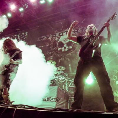 Ce n’est pas un jeune groupe qui ouvre le concert de ce soir. En effet, HYPOCRISY est une formation qui a déjà pas mal roulé sa bosse, s’étant formée en 1991 et possédant une discographie plutôt consistante. En revanche, le groupe n’a rien sorti depuis 2013 et c’est donc un set 100% de compos qui plus de 15 ans, voir 20 ans, qui nous sera proposé ce soir. Les Suédois semblent vouloir conquérir un nouveau public. Le set débute sur Fractured Millenium issu de l’album éponyme du groupe sorti en 1999, morceau vraisemblablement composé à l’occasion du passage à l’an 2000. Le chanteur/guitariste Peter Tägtgren fait partie de ces vocalistes dont la voix de s’altère pas avec les années avec un chant guttural qui lui est propre. HYPOCRISY met un point d’honneur à sortir ses bons vieux titres avec une prestation de qualité.