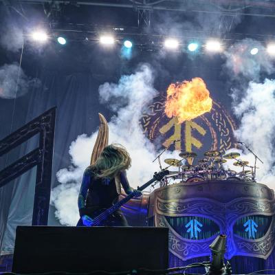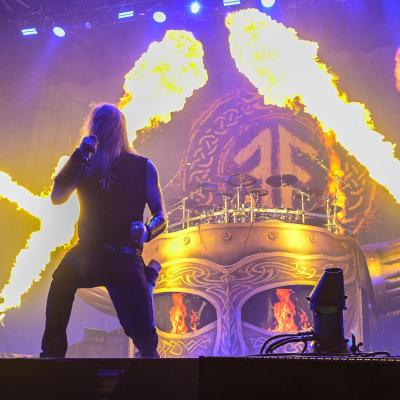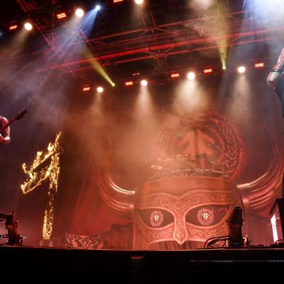 Un rideau noir orné de la double rune ansuz qui symbolise le groupe ainsi que du titre du dernier album, Berserker, est déployé afin de cacher le changement de scène pour qu’on puise découvrir la scénographie au début du premier titre. L’impatience est à son comble lorsque l’ingé-son balance Run to the Hills d’IRON MAIDEN avant que l’habituelle intro commence à se faire entendre et c’est sur les premières notes de Raven’s Flight qui le rideau tombe. La superbe batterie de Jocke Wallgren trône fièrement sur le fameux casque de viking géant, entièrement repensé avec des écrans dans les yeux où se diffuseront des images tout au long du show. S’ajoute aux décors deux runes ansuz , l’une à gauche, l’autre à droite, qui seront enflammées le temps du titre Runes to my Memory.
