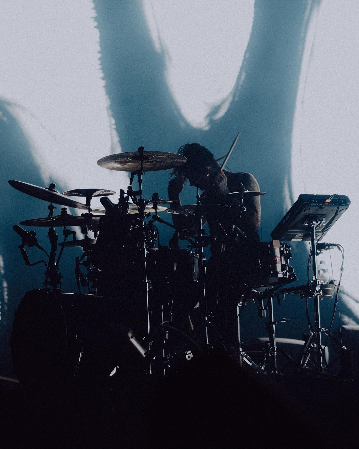 Moment fort du concert, le duo sur Human avec Jonathan Vigil, le chanteur de THE GHOST INSIDE, déclenche une ovation monumentale. Un peu plus tard, Gabi Rose la saxophoniste de BILMURI rejoint BAD OMENS sur scène pour un final de morceau aussi inattendu qu’euphorisant. À un moment suspendu, le chanteur demande au public d’allumer les lumières de leurs téléphones. Le Zénith s’illumine alors d’une mer de points lumineux, créant une communion rare entre le groupe et ses fans. Ensuite, dans un geste simple mais fort de sens, il prend son temps pour offrir deux baguettes au public, renforçant encore cette proximité.