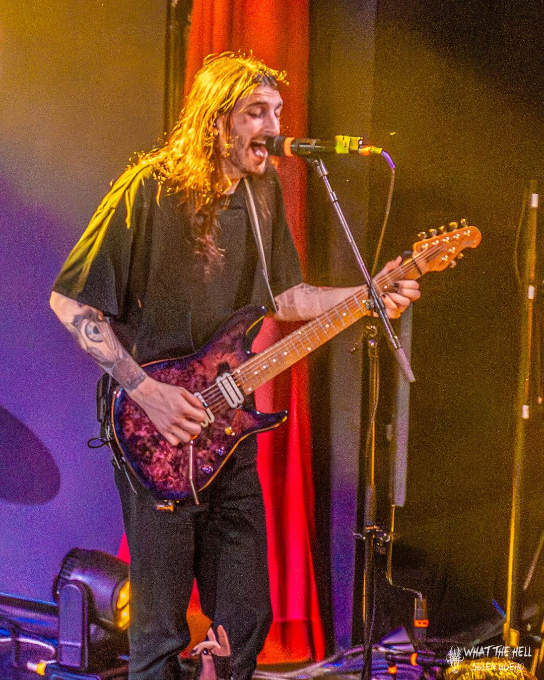 Lorsque CASKETS fait son entrée sur scène, l’atmosphère change instantanément. Vêtus de noir, les musiciens s’inscrivent parfaitement dans une esthétique sombre et introspective, renforcée par un décor évoquant des vitraux d’église projetés en fond de scène. L’ensemble confère à l’Alhambra des allures de cathédrale moderne, où la musique devient rituel collectif.