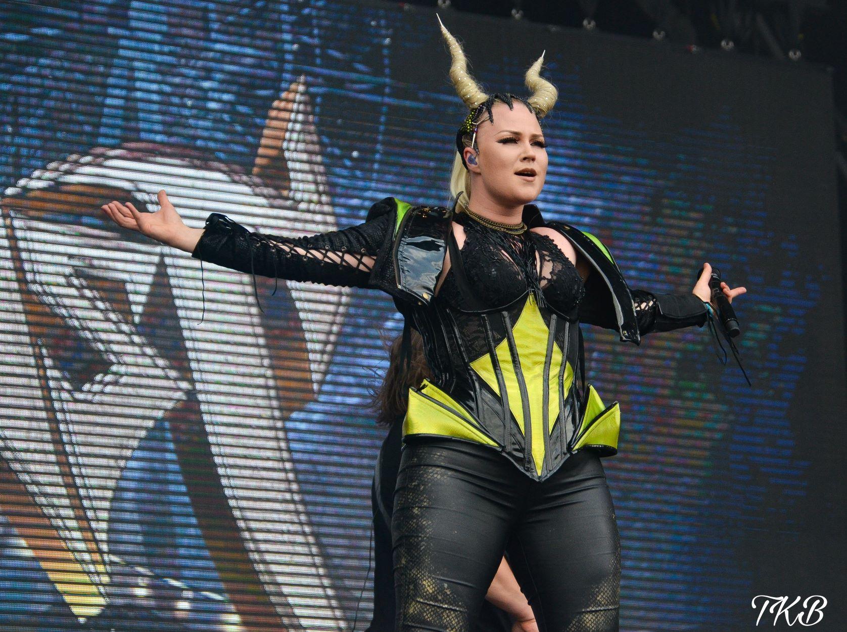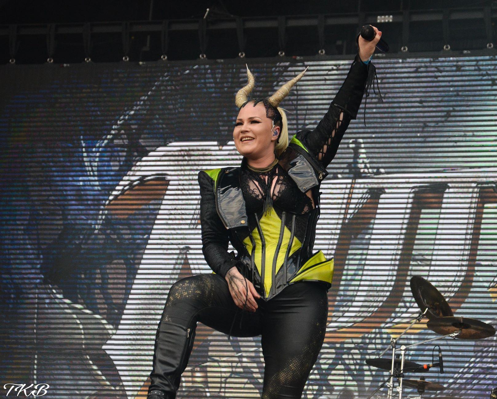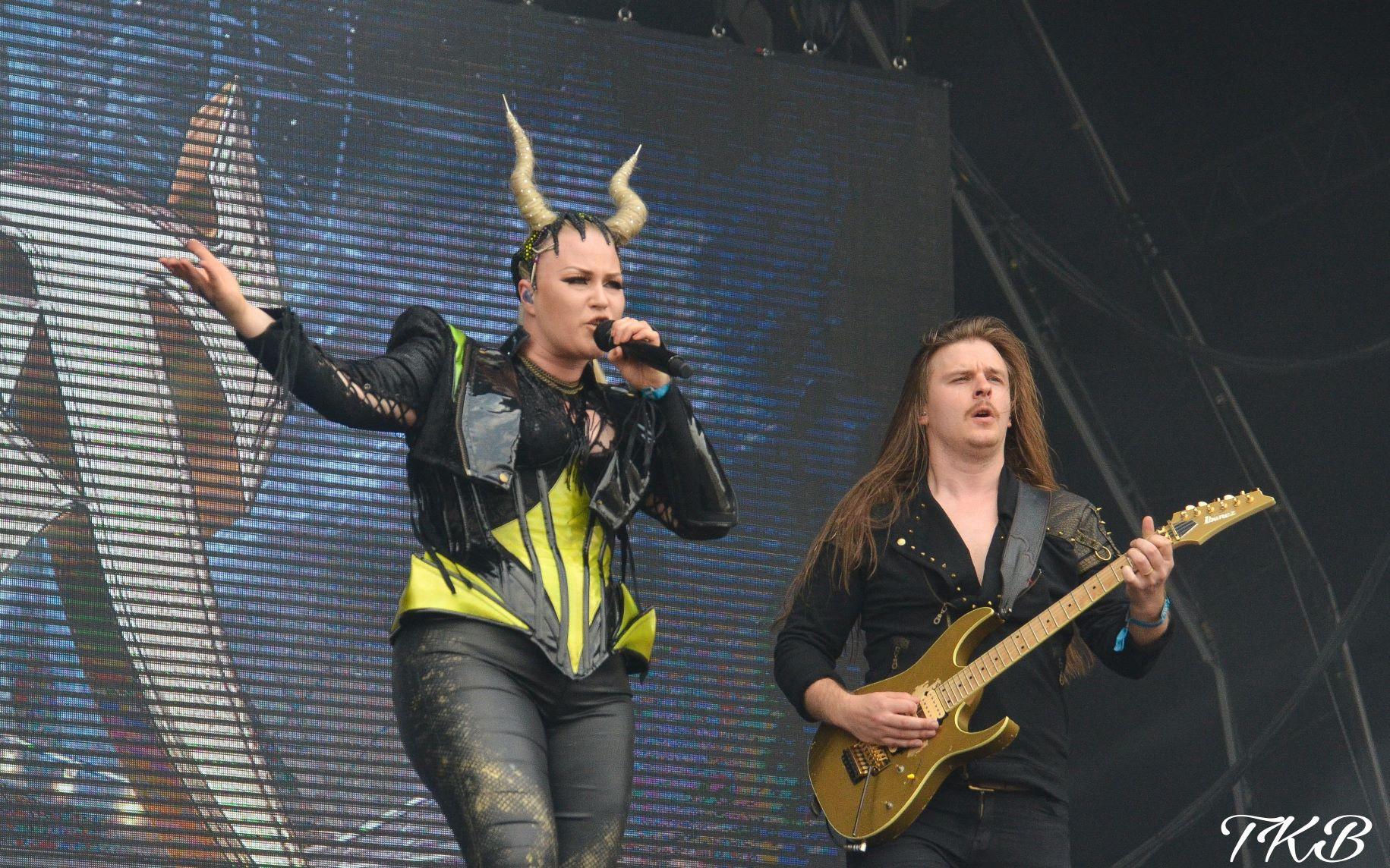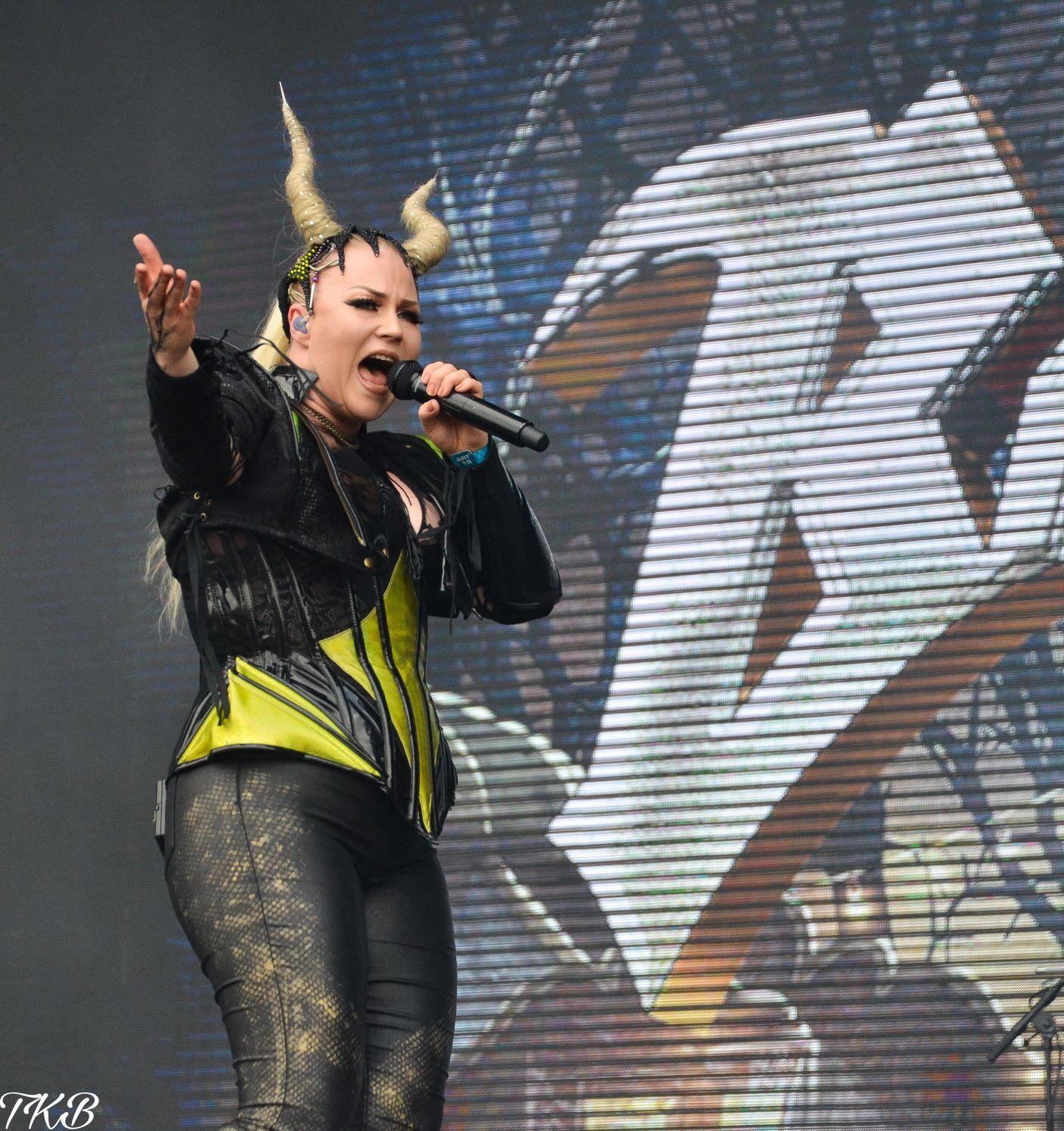 On revient maintenant sous la Temple pour de nouveau du Black Atmosphérique, teinté cette fois de folk avec les Suisses de CÂN BARDD avec une musique proche de celle des Écossais de SAOR et l’un comme l’autre nous transporte dans les paysages naturels de leurs pays respectifs et pour le coup, on a vraiment l’impression de se retrouver dans une forêt alpine rien qu’en fermant les yeux, un ressenti particulièrement percutant sur la magnifique My Ancestors, grandiose en live. Il nous reste plus qu’à attendre de les voir enchanter le Cernunnos Pagan Fest en février 2023. Sur la MS 2, c’est une toute autre ambiance avec BATTLE BEAST. Je suis personnellement le groupe depuis une bonne dizaine d’année, découvert en 2012 en special guests de NIGHTWISH à Bercy. Entre-temps le groupe a changé de chanteuse et c’est toujours Noora Louhimo de sa voix rauque qui porte le micro. Depuis le départ du guitariste et ex-leader-compositeur, on aurait pu croire que tout s’arrêterait mais depuis les Finlandais n’ont pas chômé. En nous présentant son dernier album Circus Of Doom, BATTLE BEAST est toujours aussi énergique en live, une énergie transmise au public qui apprécie écouter du bon vieux Heavy Metal mais avec beaucoup de sonorités modernes, avec de véritables tubes que sont Eye Of The Storm, Wings of Light ou encore King for a Day. Noora fera sensation avec sa tenue atypique et ses cornes de diablesses qui font tout le charme de cette chanteuse hors pair.