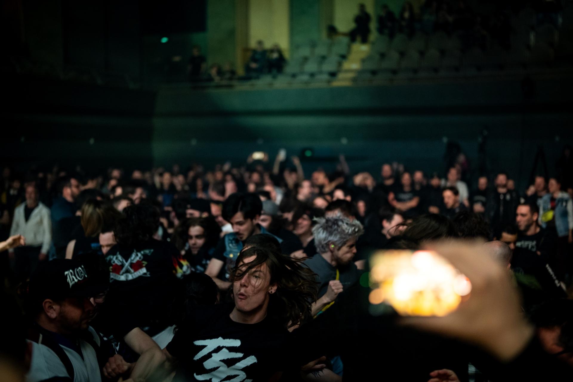 Pas le temps de se reposer, la première session d’Air Guitar à peine terminée, BENIGHTED arrive sur scène pour un nouveau méfait sur la diabolique intro Prodrome. C’est parti pour une première salve de blast avec le morceau Scars. Le chanteur Julien Truchan est toujours aussi précis dans ses gutturaux, que ce soit le growl ou le pig squeal. Puis enchainement sur X2Y et Reptilian. C’est toujours l’effervescence dans un pit qui s’en donne à cœur joie. Puis c’est l’heure de présenter leur nouvel album Ekbom et c’est là que Julien nous explique qu’ils ont eu la merveilleuse idée de faire un morceau à 402 BPM et qu’ils vont devoir le jouer sur scène ! Forcément, les Stéphanois auront besoin d’encouragements et rien de telle que de retourner le pit de la Cité de la Musique. Effectivement, avec Nothing Left To Fear, BENIGHTED nous lâche un sprint à la Usain Bolt, une véritable prouesse technique.
