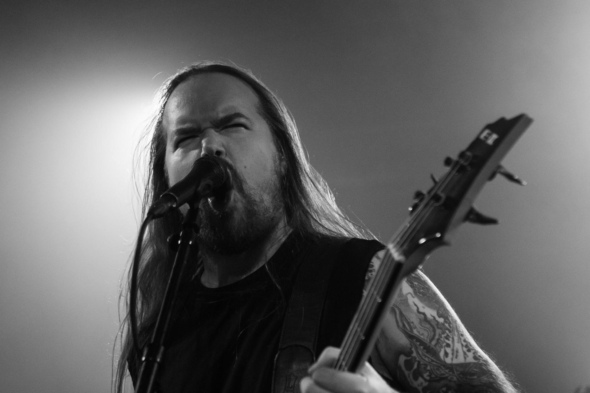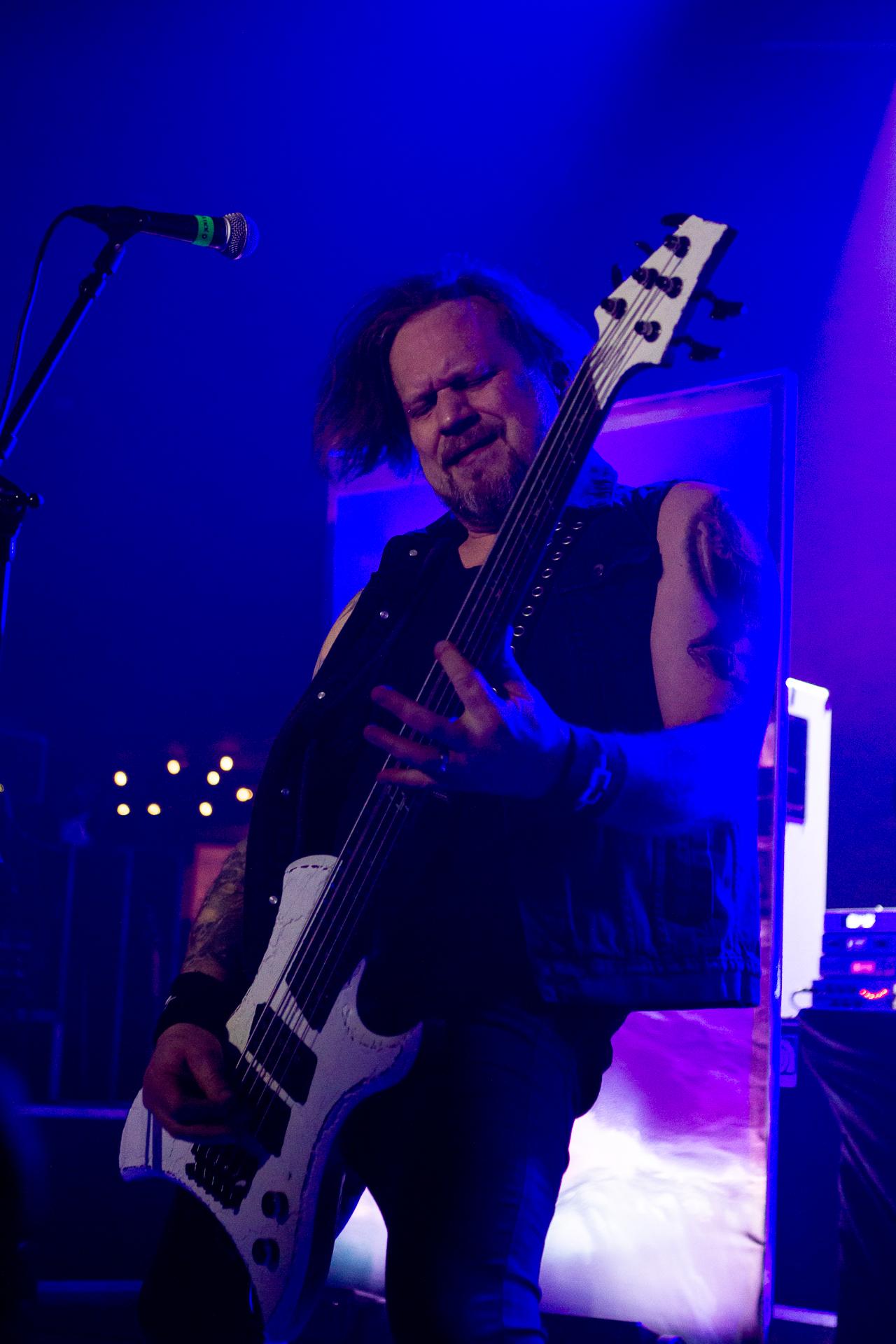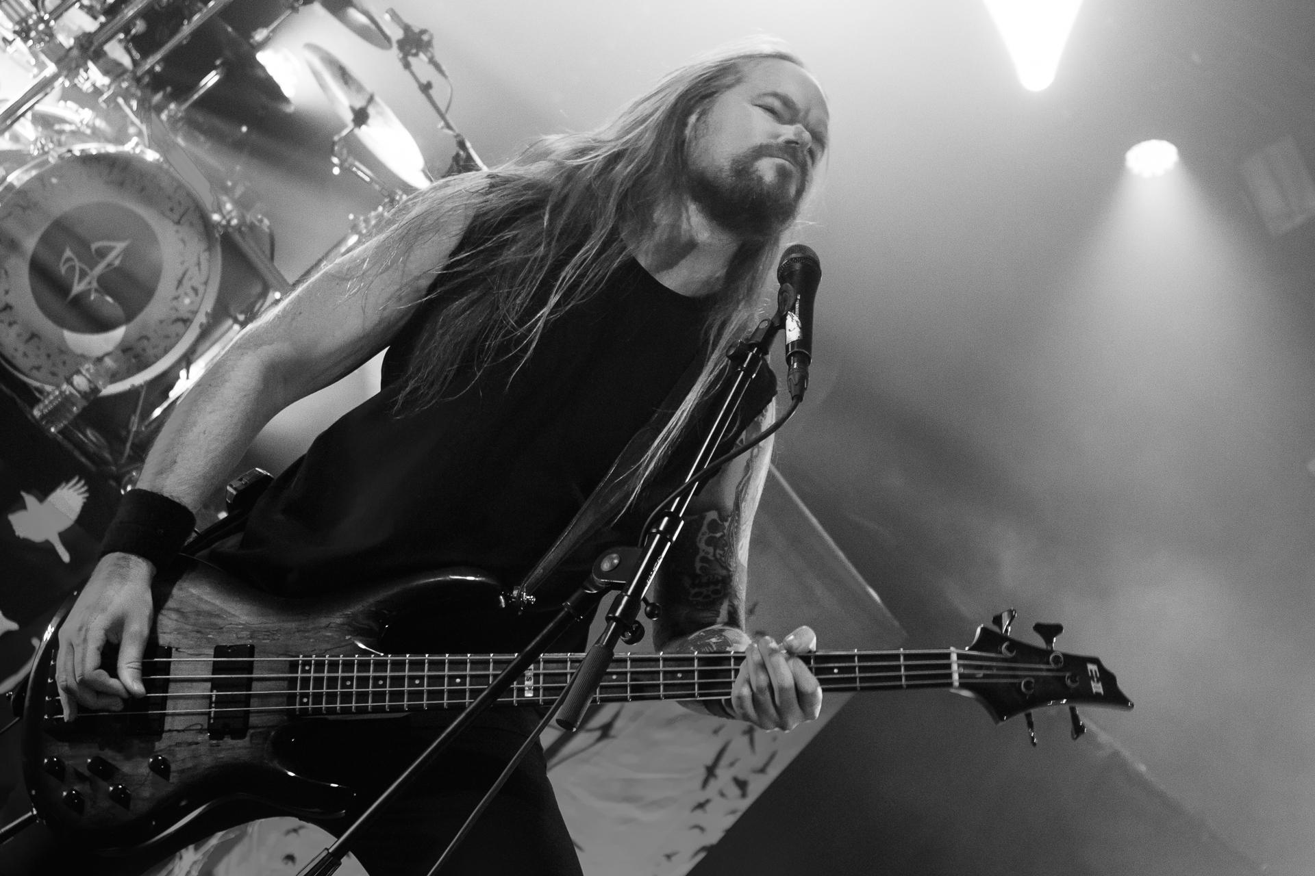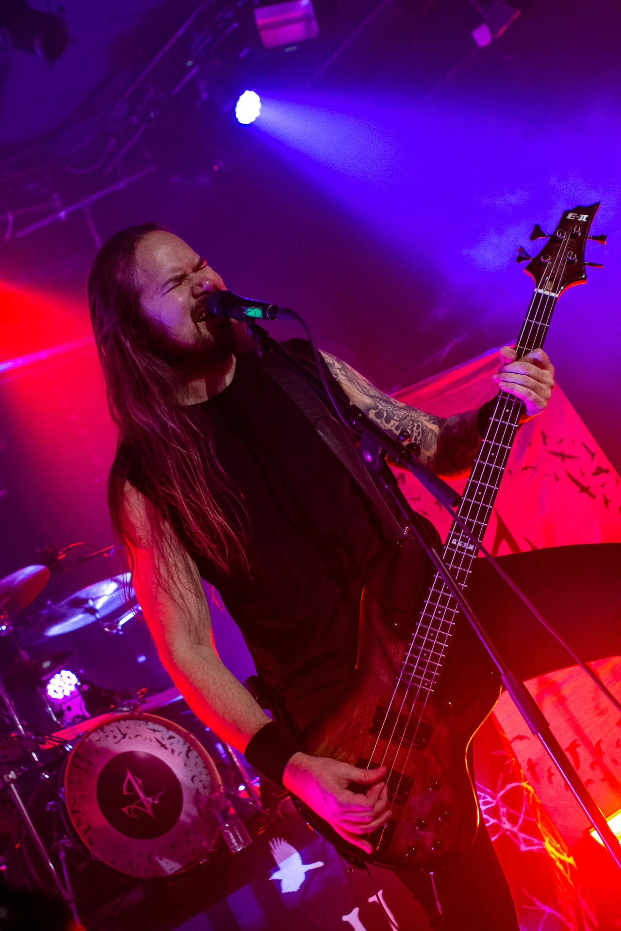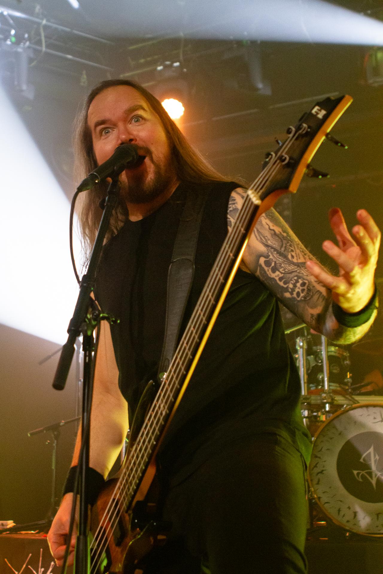 Arrive enfin le moment le plus attendu : l’arrivée sur scène d’INSOMNIUM avec, bien entendu, le retour de Markus qui, vous l’aviez déjà compris, a fait les deux sets. Évidemment, puisque leur album Shadows of the Dying Sun est la vedette, c’est forcément sur The Primeval Dark que le set débute, ce morceau qui sert d’introduction au titre le plus emblématique du groupe, While We Sleep. Là encore, l’assistance est ravie car cet album regorge d’excellents morceaux tels que Black Heart Rebellion, Ephemeral ou encore The Promethean Song. Le chanteur et bassiste Niilo Sevänen fait toujours preuve d’une parfaite maîtrise entre le chant et son jeu à la basse. Nous aurons également droit à un petit brin de voix des guitaristes sur The River. Le groupe se donne à fond pour que leur album culte retrouve toutes ses lettres de noblesse. Le show atteint son point culminant lors de l’interprétation du titre éponyme Shadows of the Dying Sun, marquant le début de la fin du set.