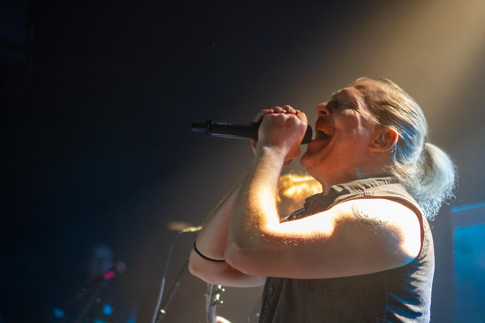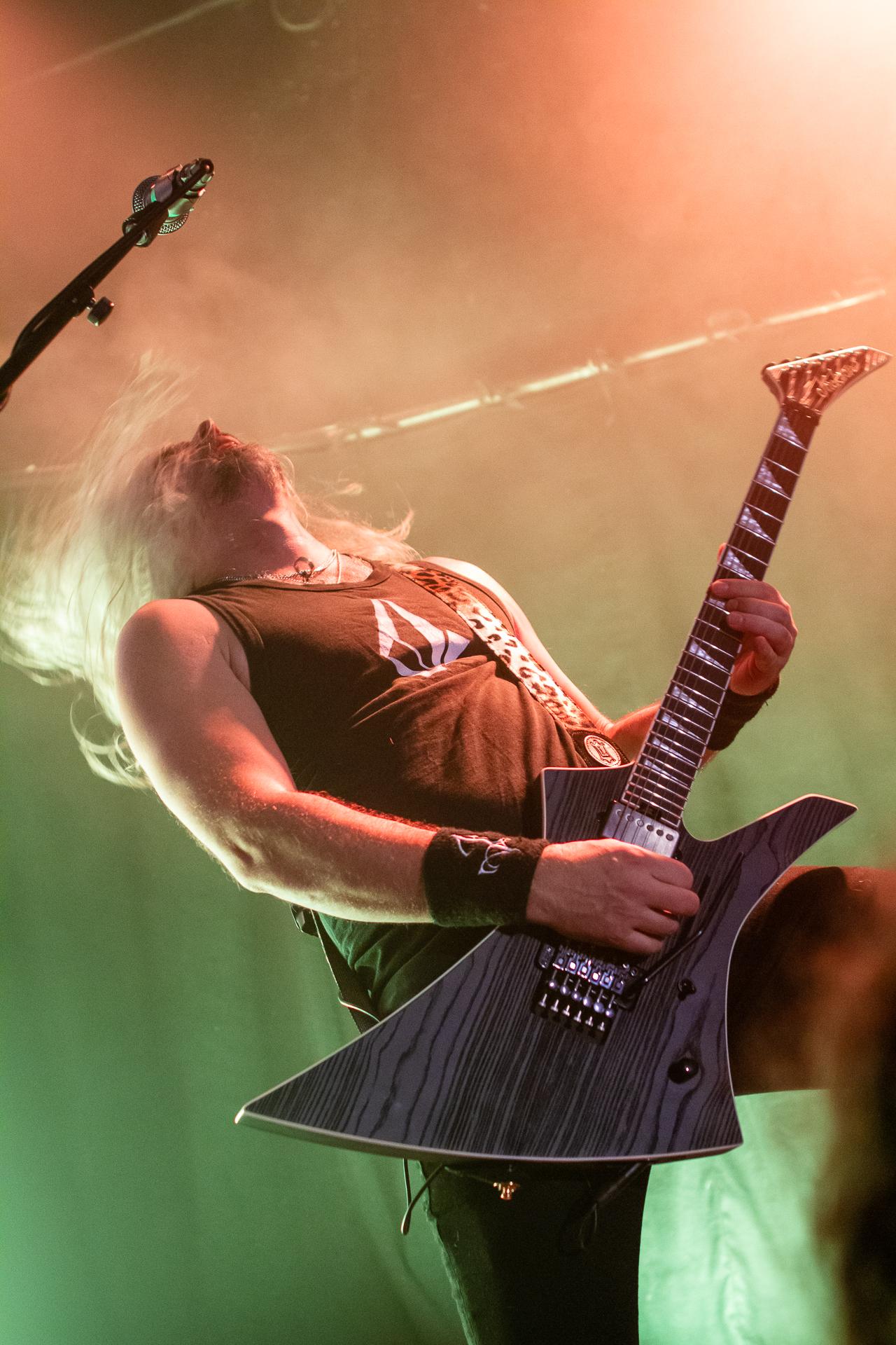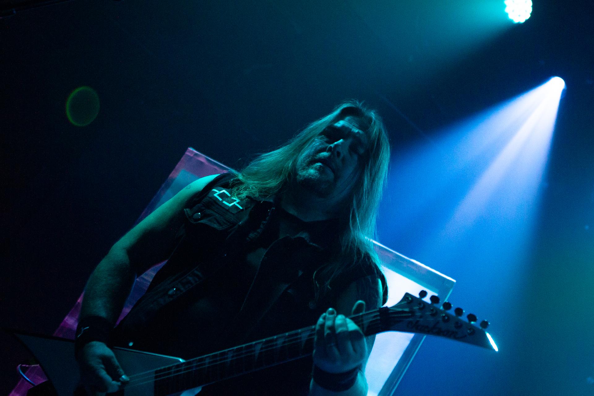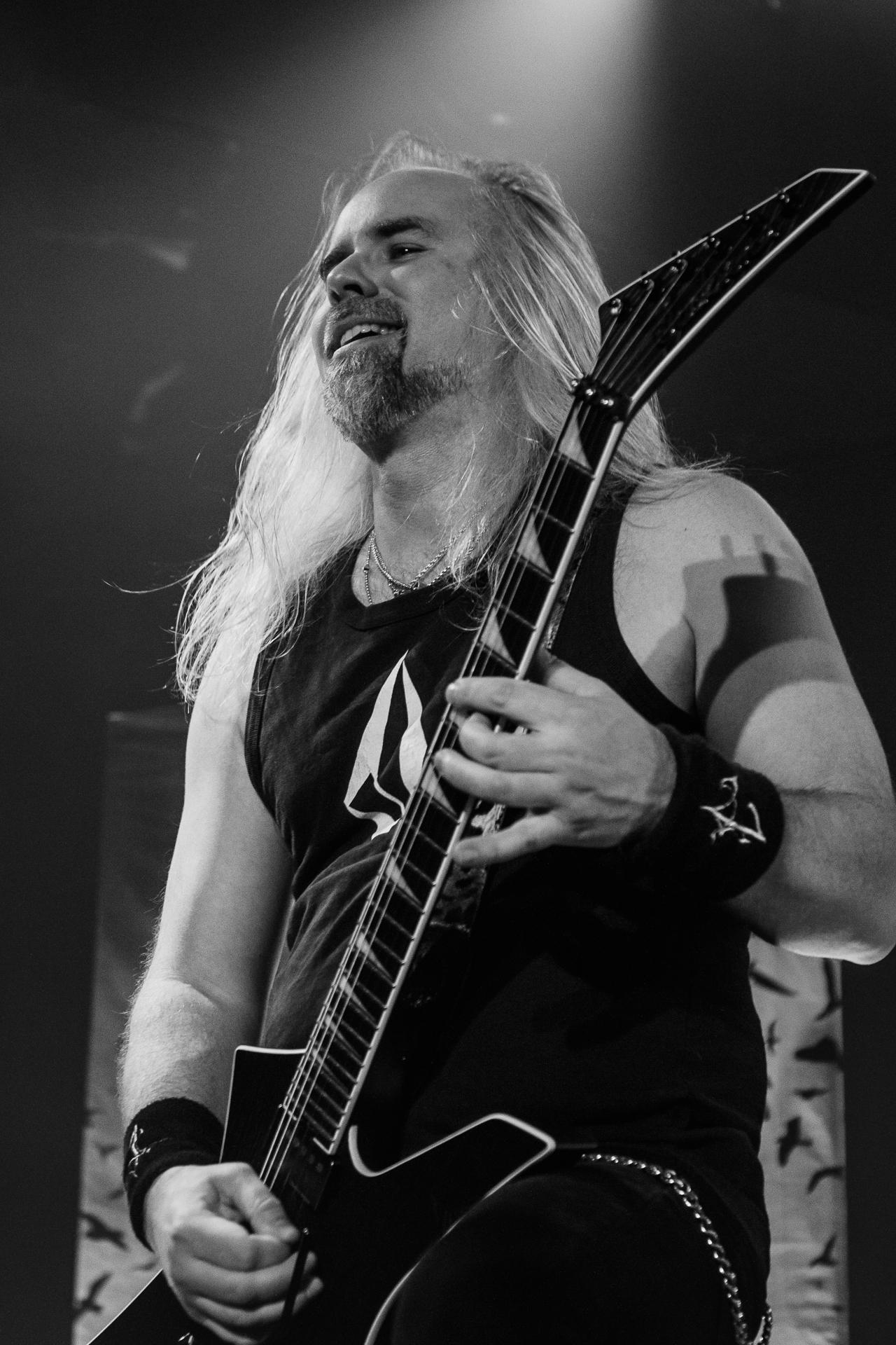 Arrive enfin le moment le plus attendu : l’arrivée sur scène d’INSOMNIUM avec, bien entendu, le retour de Markus qui, vous l’aviez déjà compris, a fait les deux sets. Évidemment, puisque leur album Shadows of the Dying Sun est la vedette, c’est forcément sur The Primeval Dark que le set débute, ce morceau qui sert d’introduction au titre le plus emblématique du groupe, While We Sleep. Là encore, l’assistance est ravie car cet album regorge d’excellents morceaux tels que Black Heart Rebellion, Ephemeral ou encore The Promethean Song. Le chanteur et bassiste Niilo Sevänen fait toujours preuve d’une parfaite maîtrise entre le chant et son jeu à la basse. Nous aurons également droit à un petit brin de voix des guitaristes sur The River. Le groupe se donne à fond pour que leur album culte retrouve toutes ses lettres de noblesse. Le show atteint son point culminant lors de l’interprétation du titre éponyme Shadows of the Dying Sun, marquant le début de la fin du set.