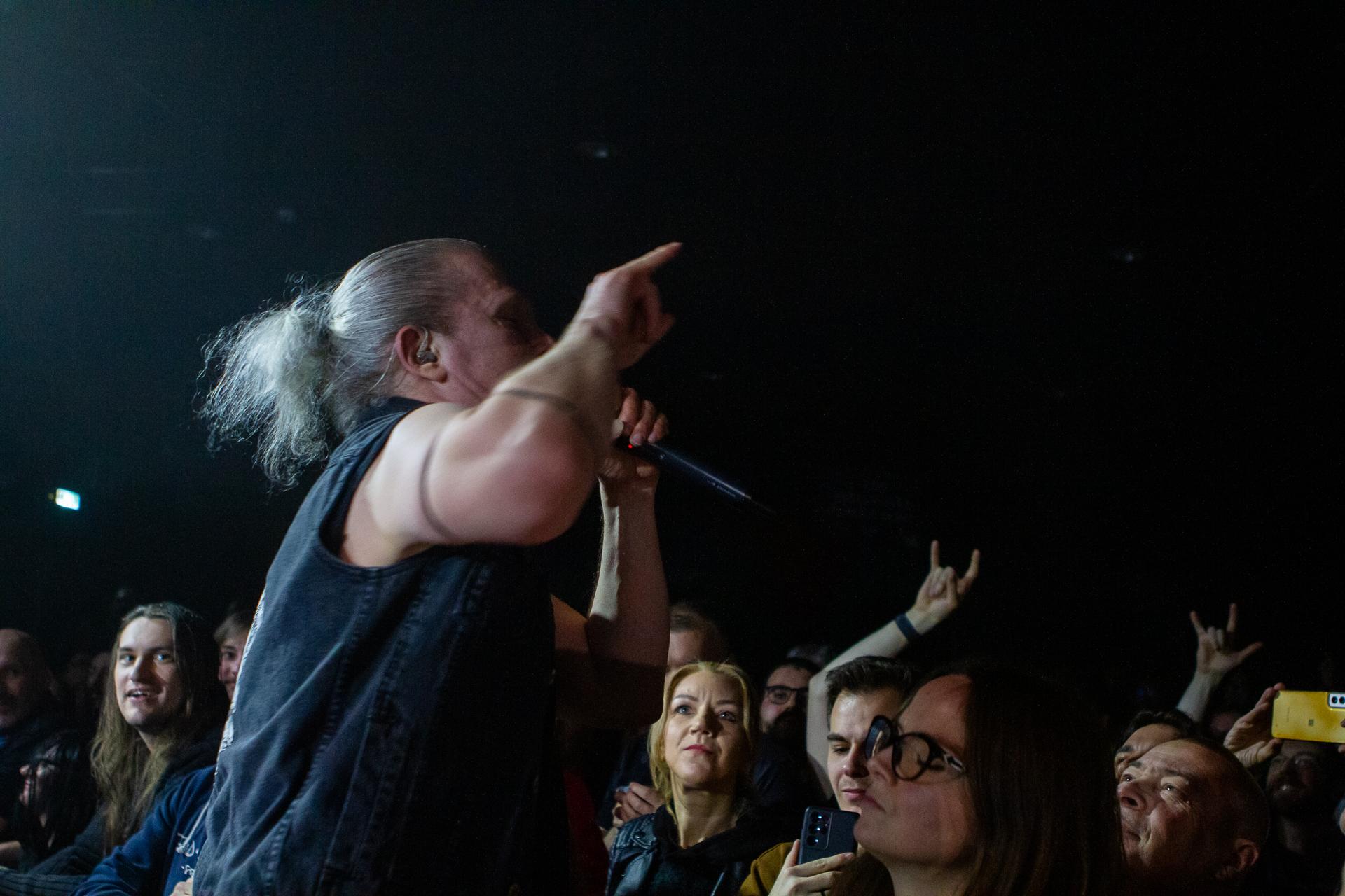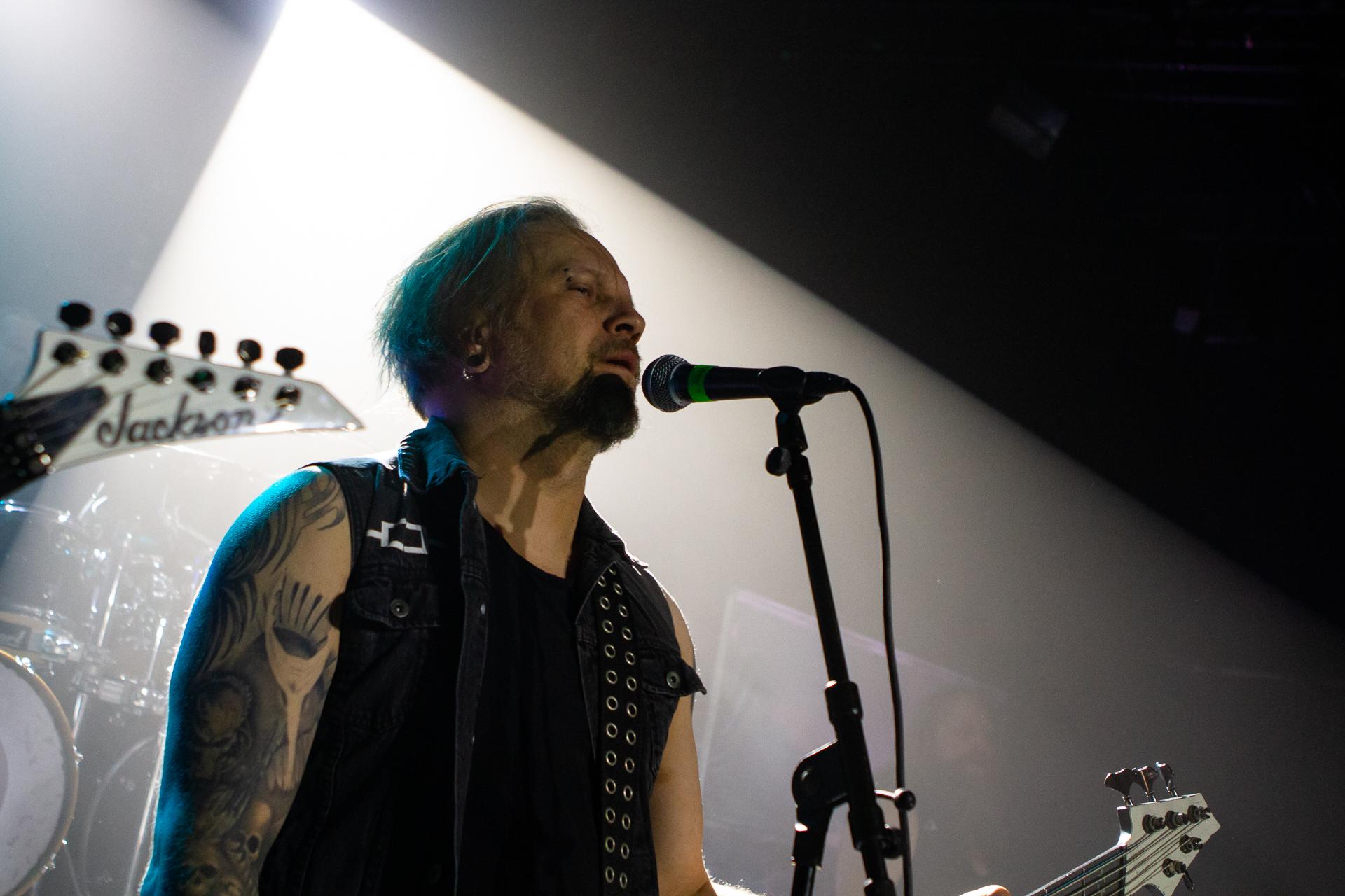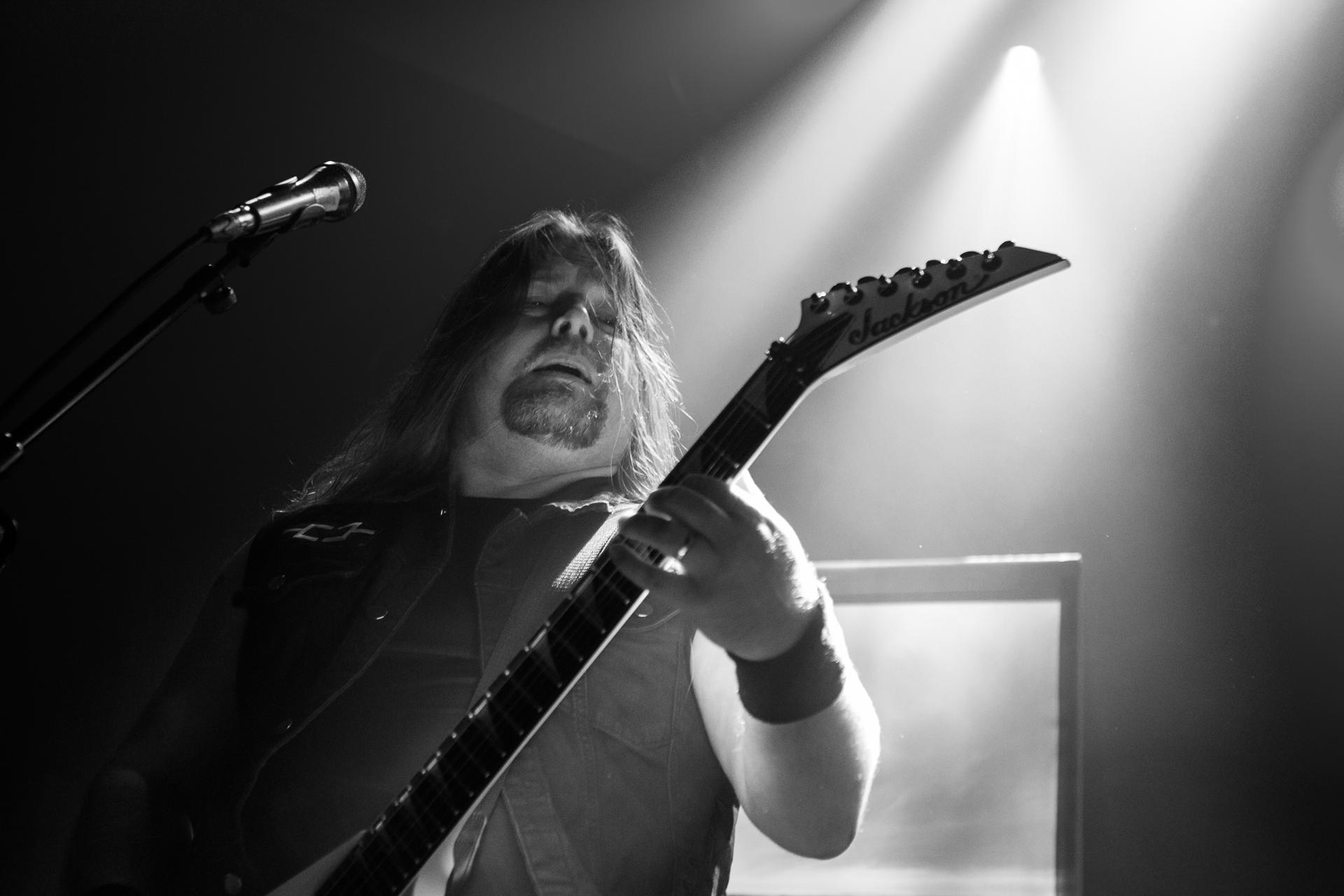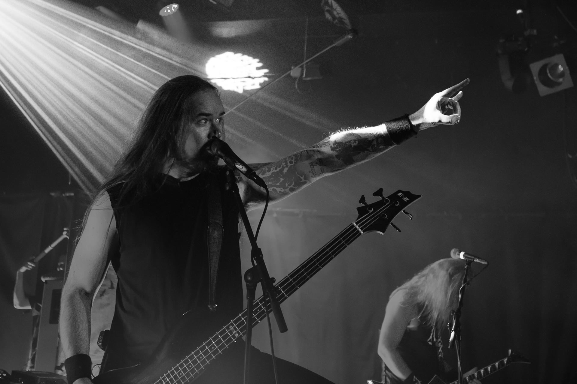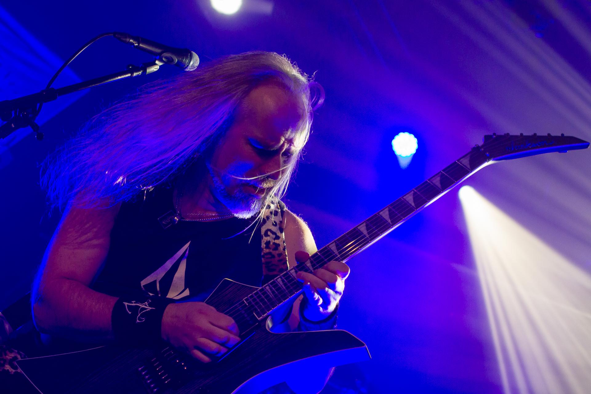 Arrive enfin le moment le plus attendu : l’arrivée sur scène d’INSOMNIUM avec, bien entendu, le retour de Markus qui, vous l’aviez déjà compris, a fait les deux sets. Évidemment, puisque leur album Shadows of the Dying Sun est la vedette, c’est forcément sur The Primeval Dark que le set débute, ce morceau qui sert d’introduction au titre le plus emblématique du groupe, While We Sleep. Là encore, l’assistance est ravie car cet album regorge d’excellents morceaux tels que Black Heart Rebellion, Ephemeral ou encore The Promethean Song. Le chanteur et bassiste Niilo Sevänen fait toujours preuve d’une parfaite maîtrise entre le chant et son jeu à la basse. Nous aurons également droit à un petit brin de voix des guitaristes sur The River. Le groupe se donne à fond pour que leur album culte retrouve toutes ses lettres de noblesse. Le show atteint son point culminant lors de l’interprétation du titre éponyme Shadows of the Dying Sun, marquant le début de la fin du set.