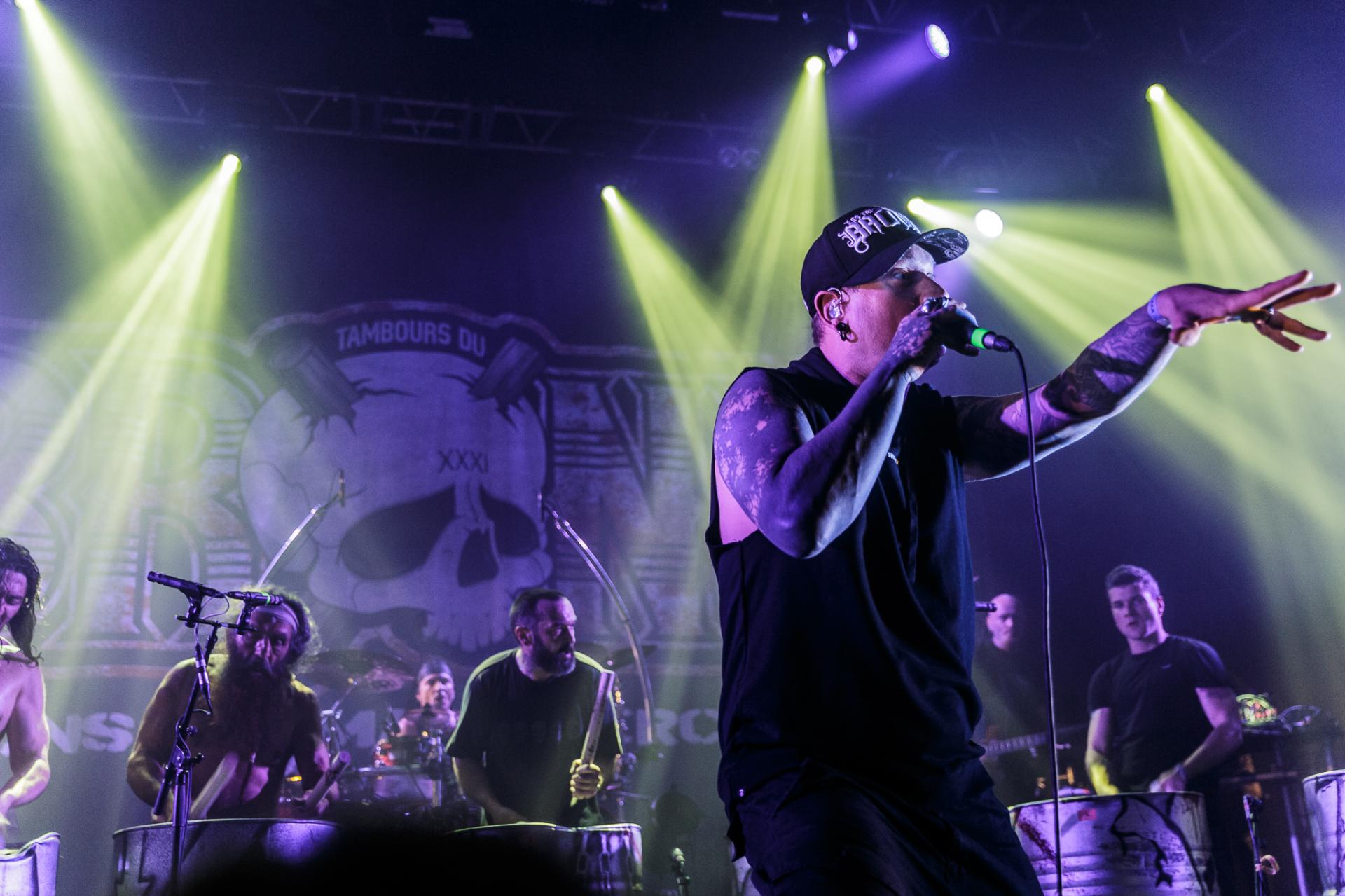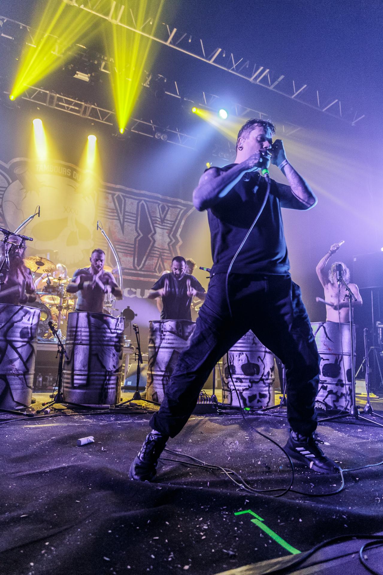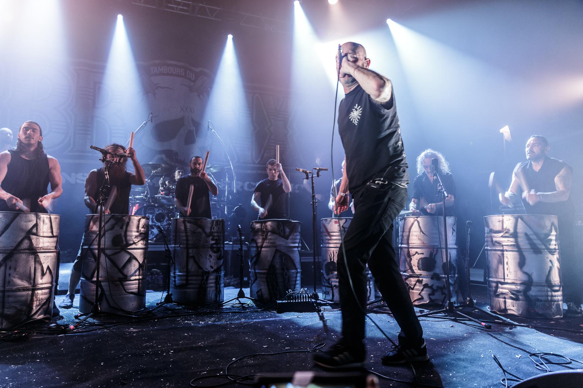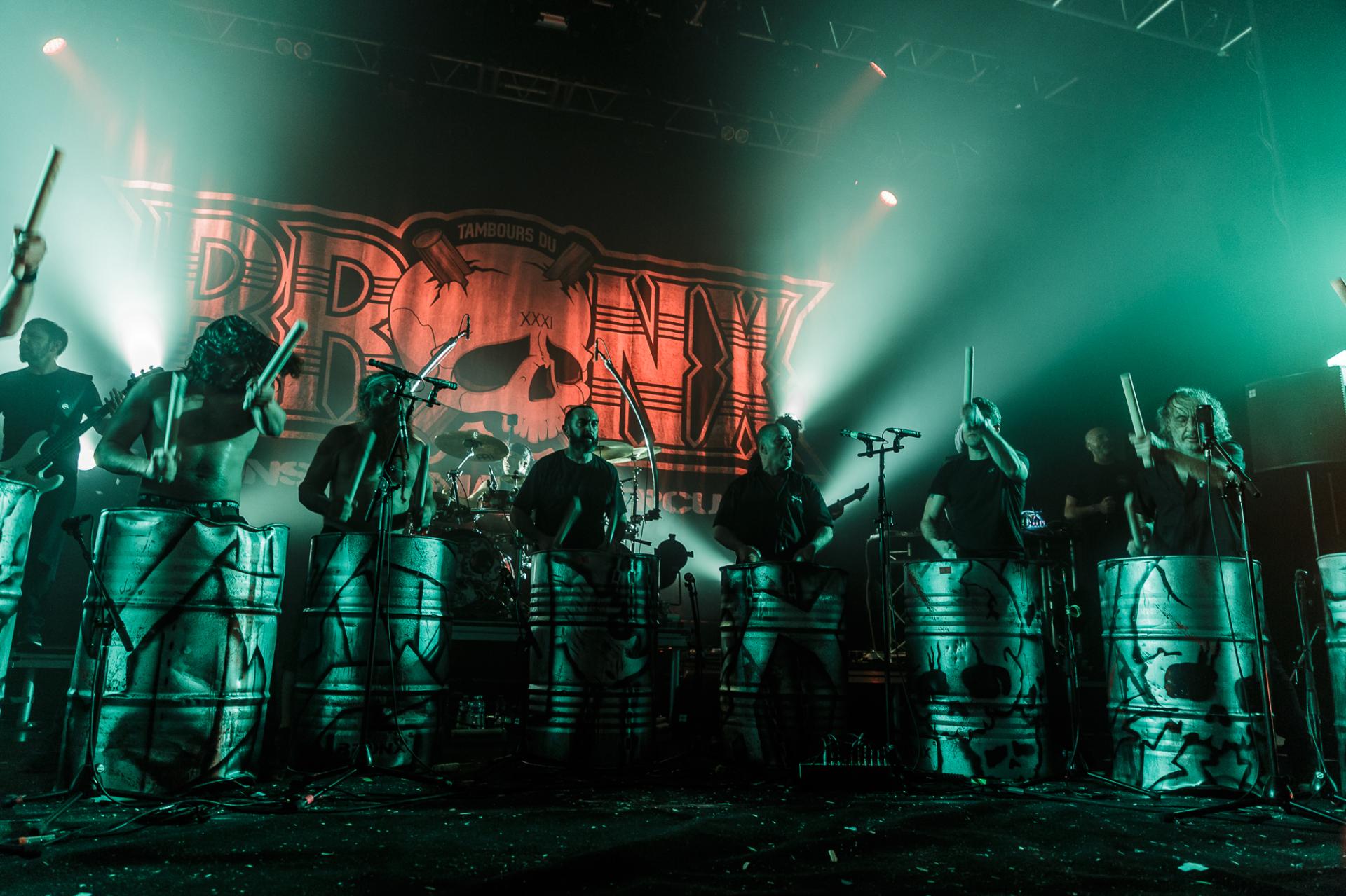 Déjà 6 ans que LES TAMBOURS DU BRONX propose un show Metal après avoir œuvré pendant quelques décennies dans un spectacle plus centré sur les percussions. Avec l’arrivée de Franky Costanza à la batterie qui vient sublimer les chocs sur les bidons, des chansons à textes et des instruments électriques, le collectif a réussi à devenir un groupe de metal à part entière. La scénographie ne change pas, 9 bidons répartis sur la largueur de la scène et la batterie qui trône fièrement en arrière.