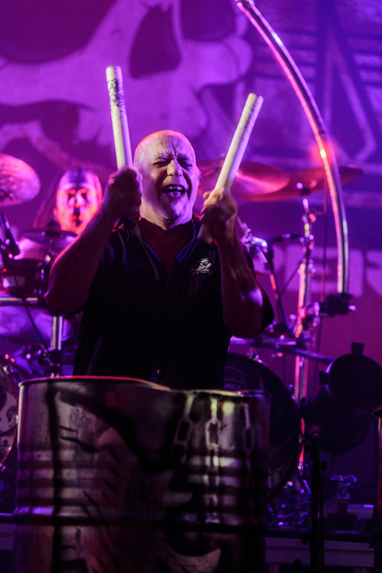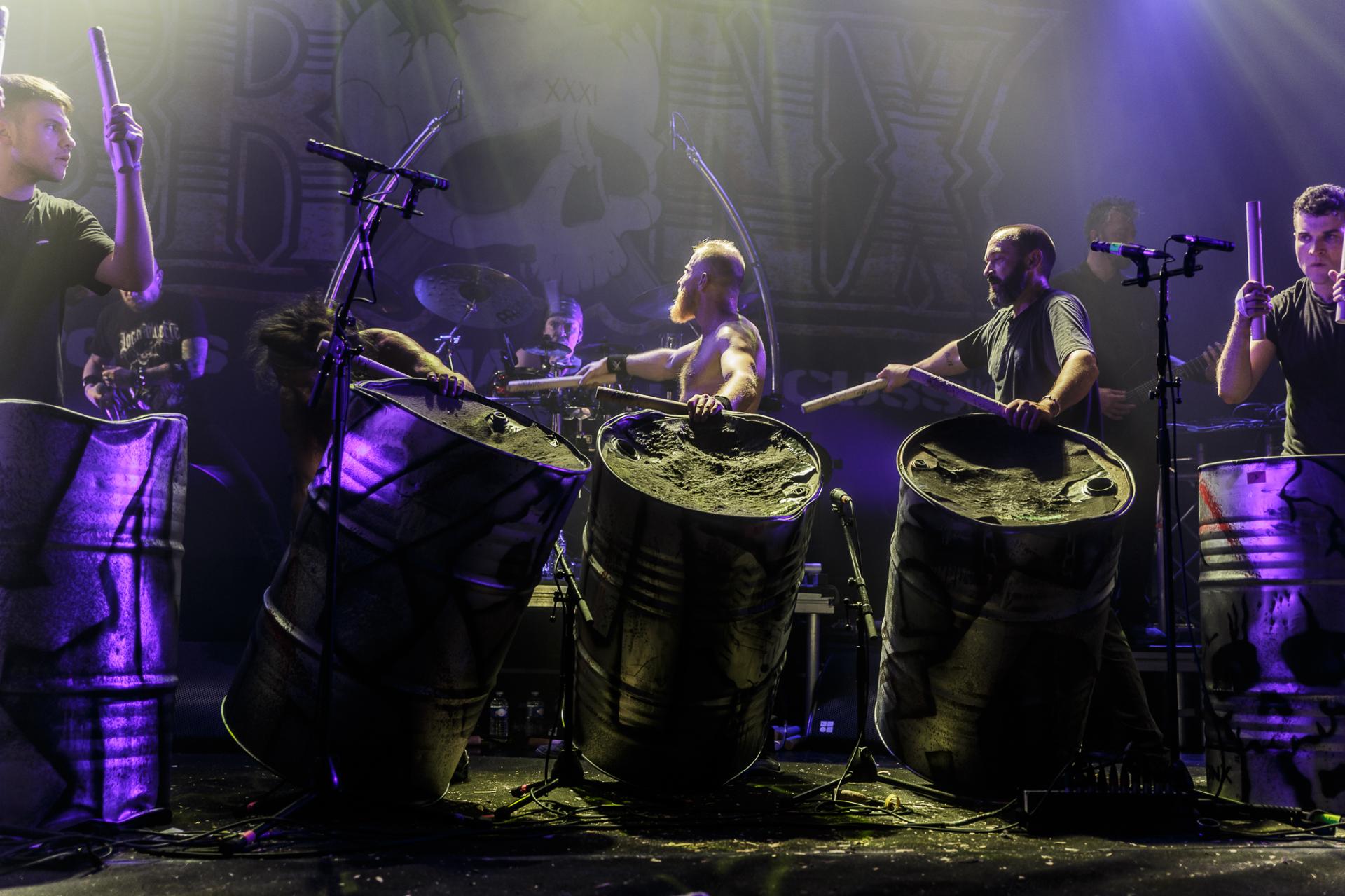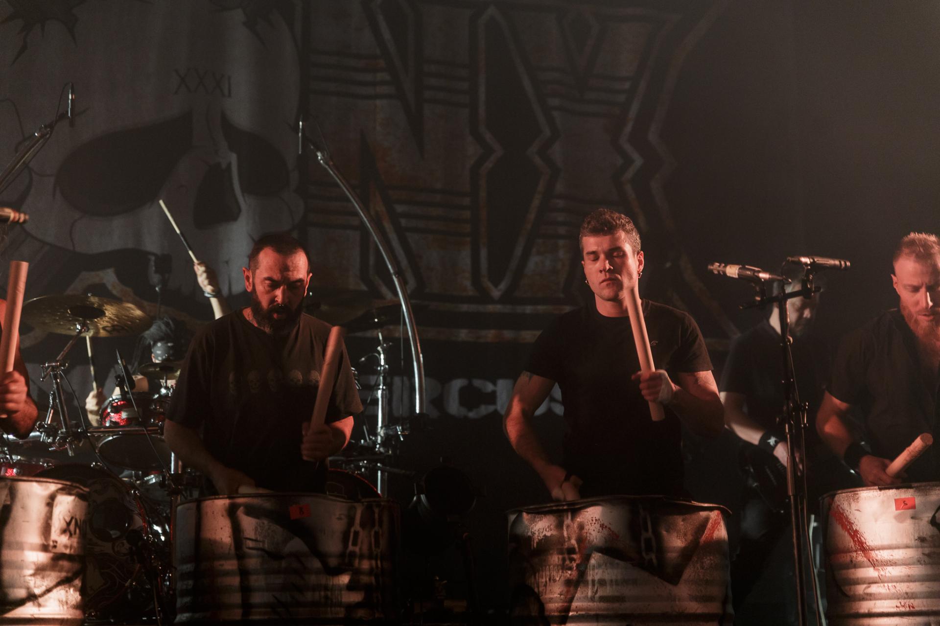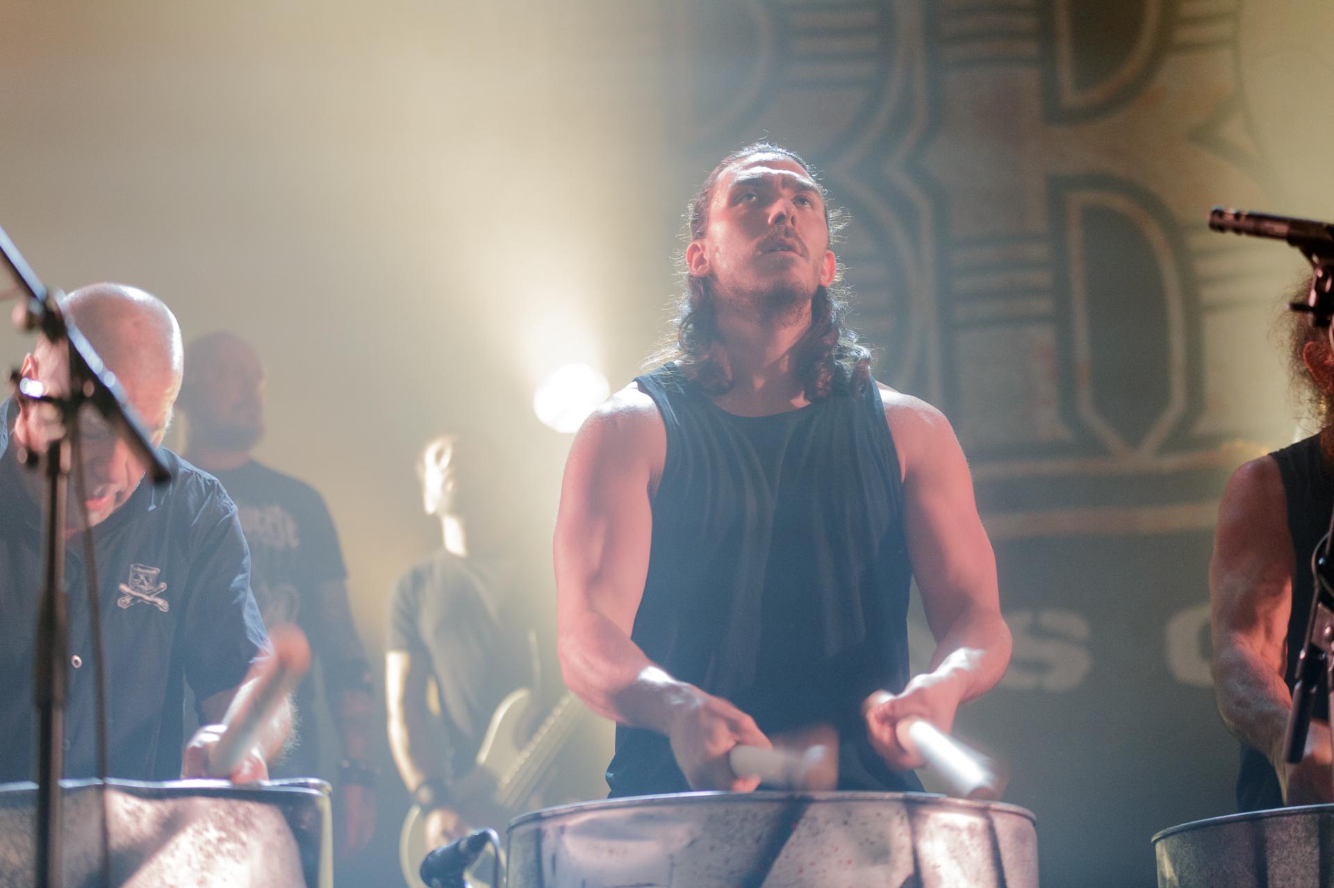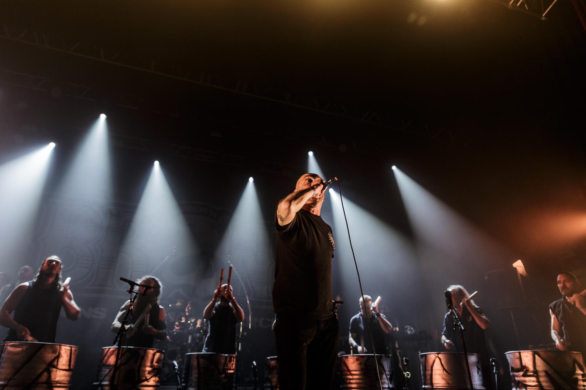 Déjà 6 ans que LES TAMBOURS DU BRONX propose un show Metal après avoir œuvré pendant quelques décennies dans un spectacle plus centré sur les percussions. Avec l’arrivée de Franky Costanza à la batterie qui vient sublimer les chocs sur les bidons, des chansons à textes et des instruments électriques, le collectif a réussi à devenir un groupe de metal à part entière. La scénographie ne change pas, 9 bidons répartis sur la largueur de la scène et la batterie qui trône fièrement en arrière.
