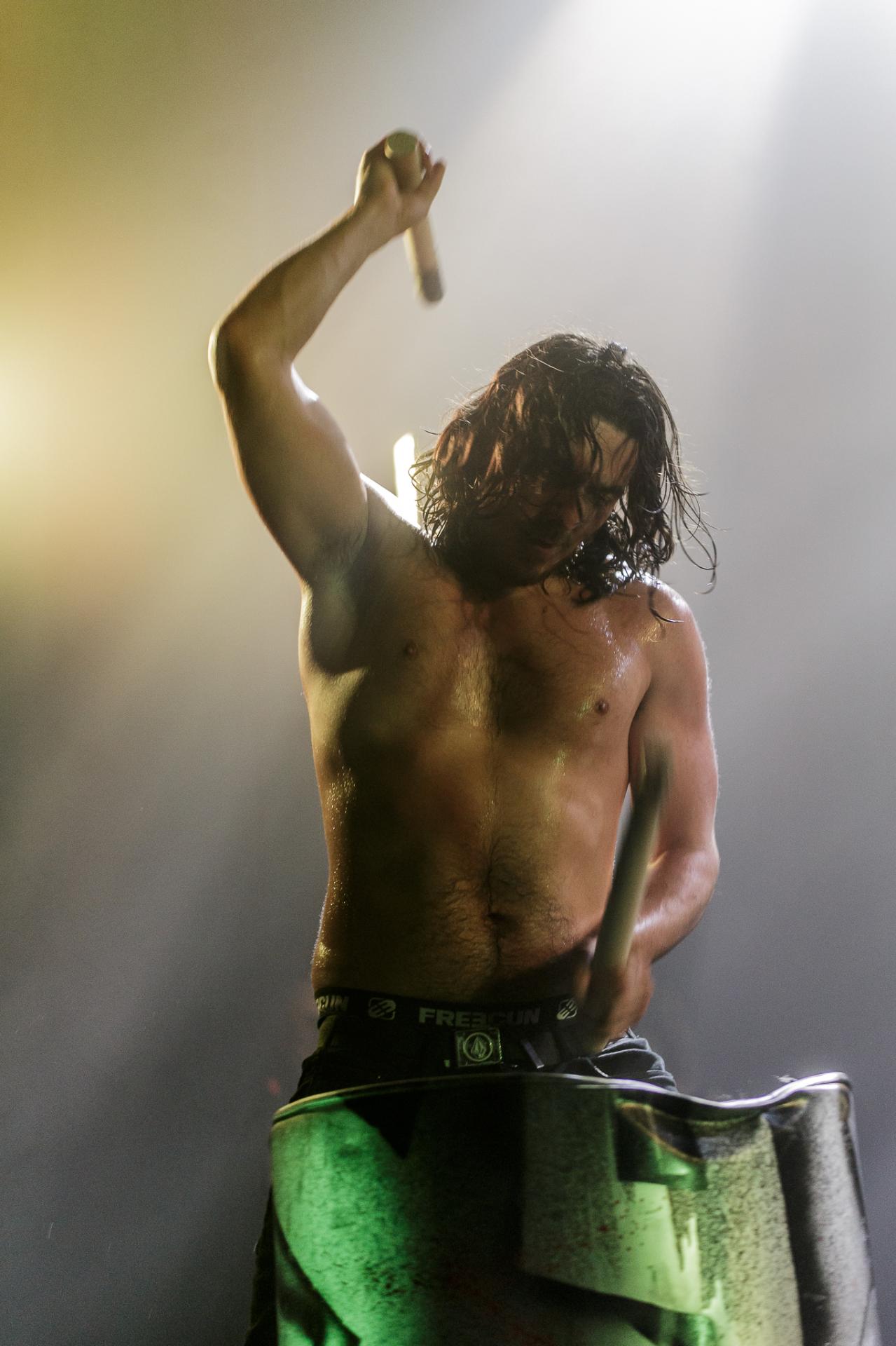 La frappe des percussionnistes sont si puissantes qu’ils en cassent leurs gourdins avec des copeaux qui volent de tous les côtés. Après plusieurs titres de l’album EVILUTION, Les Tambours n’hésiteront pas à revenir sur Weapons of Mass Percussion avec Mirage Éternel, New Day ou encore Le festin. Entre temps, les percussionnistes nous feront une démonstration magistrale de frappe en rythme, une véritable tribu tribale !