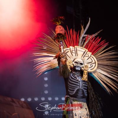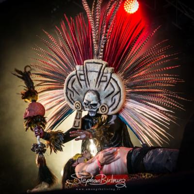 Nous ne verrons malheureusement pas les premiers groupes de la journée, faute de sommeil à rattraper. J’arrive donc sur le site des concerts au moment où les Mexicains de CEMICAN sont en train de jouer sur la Temple. J’ai déjà eu l’occasion de découvrir ce groupe lors du Cernunnos Pagan Fest de cette année et ce qui frappe chez eux c’est l’originalité de leur show qui a des allures de rituels Aztèques à coup de flûtes et de percussions folkloriques assimilés à cette tribu. Le combo comprend cinq musiciens, qui représente les guerriers de la tribu, ainsi qu’un danseur qui représente quant à lui une sorte de shaman, un sorcier Amérindien. Musicalement on a un mélange de sonorités propre au Metal et de musique folklorique propre à la culture Mexicaine, le tout associé à une scénographie atypique, de quoi ravir les festivaliers qui ont soif de nouveautés. Encore une affaire à suivre.