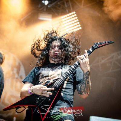 On change de côté pour CANNIBAL CORPSE. Le combo Floridien, qui est un habitué du festival, est toujours très attendu. Les membres arrivent sur scène sans intro et balance sans transition le titre Evisceration Plague. Ni une, ni deux, c’est déjà le gros bazar dans le pit avec pogos et slam en tout genre. Côté scène, le groupe est en pleine forme. Les musiciens envoient toute la sauce avec la brutalité de leur death metal et la puissance de la voix du Corpsegrinder George Fisher, s’ajoutant à ça son talent pour le headbang rotatif. Si le son est parfaitement mixé, la setlist n’en demeure pas moins efficace, celle-ci étant composée que de tubes du groupe tel que Scourge of Iron, Devoured by Vermin ou encore A Skull Full of Maggots. L’album Red Before Black sorti en 2017 sera également exploré, notamment avec Code of the Slashers et son titre éponyme. Mais ce sera la fin du set qui sera le plus marquant avec quatre grands classiques du combo avec I Cum Blood, Make Them Suffer, Stripped, Raped and Strangled et bien entendu c’est Hammer Smashed Face qui clôturera le set. CANNIBAL CORPSE nous aura encore mis une belle mandale de sonorités brutale comme on les aime.