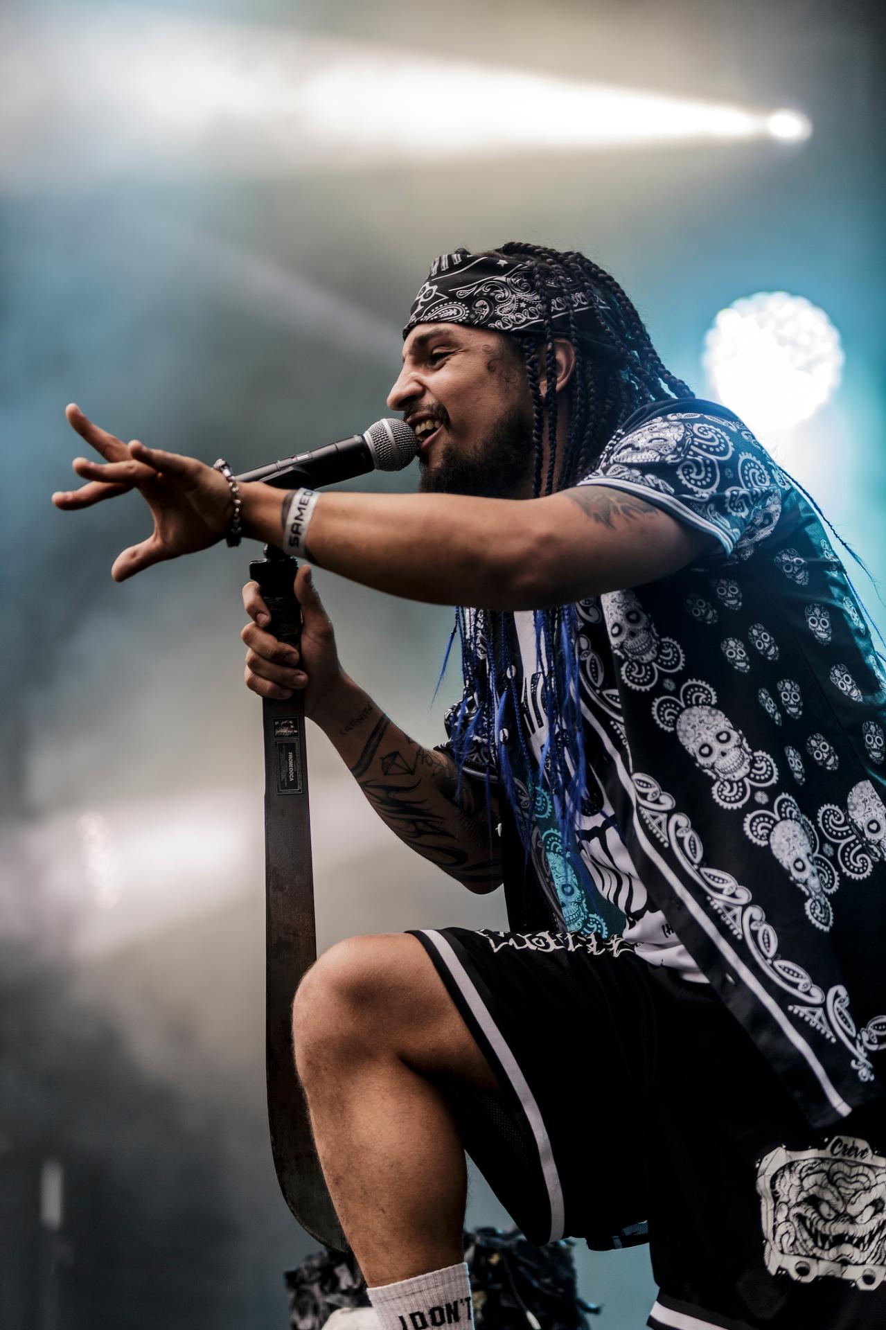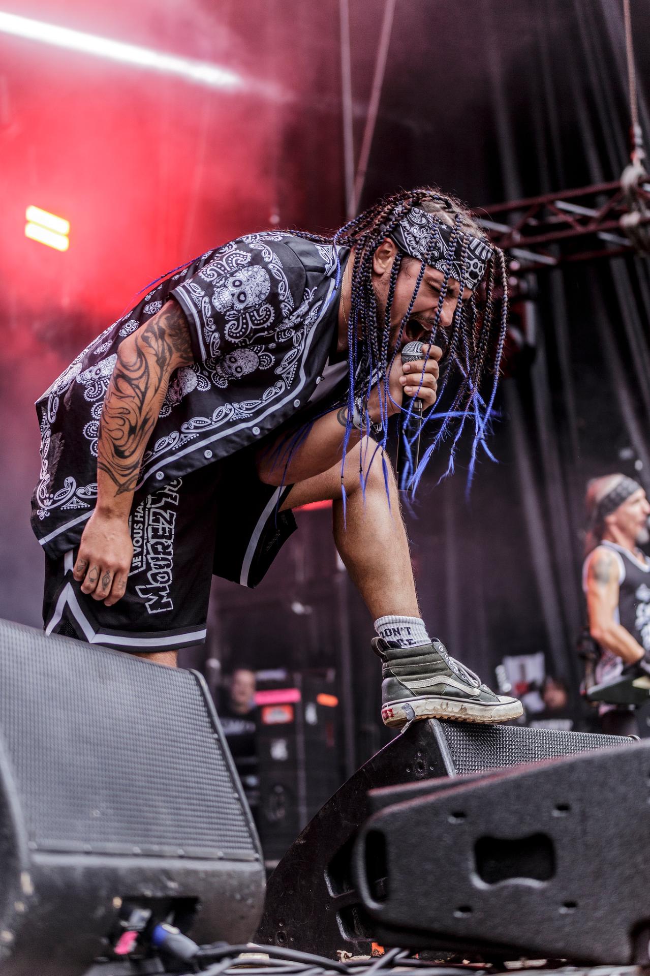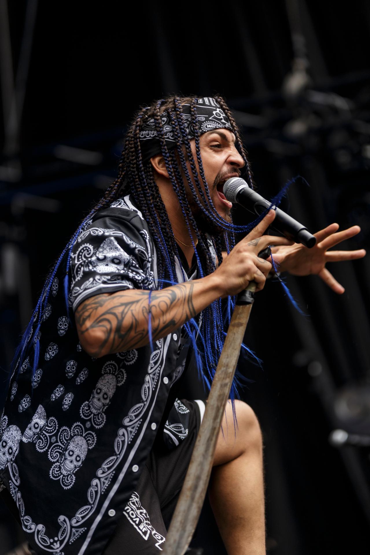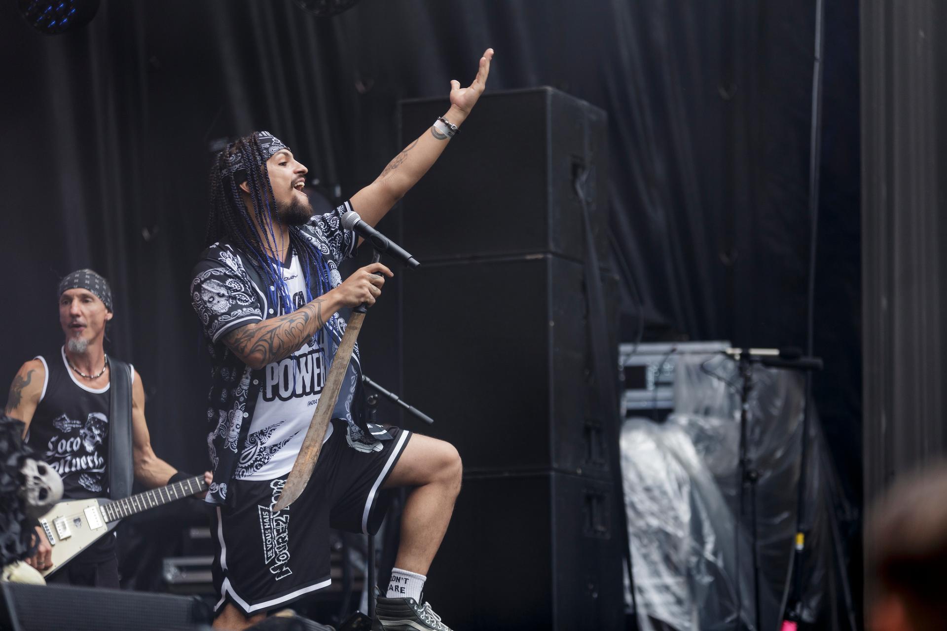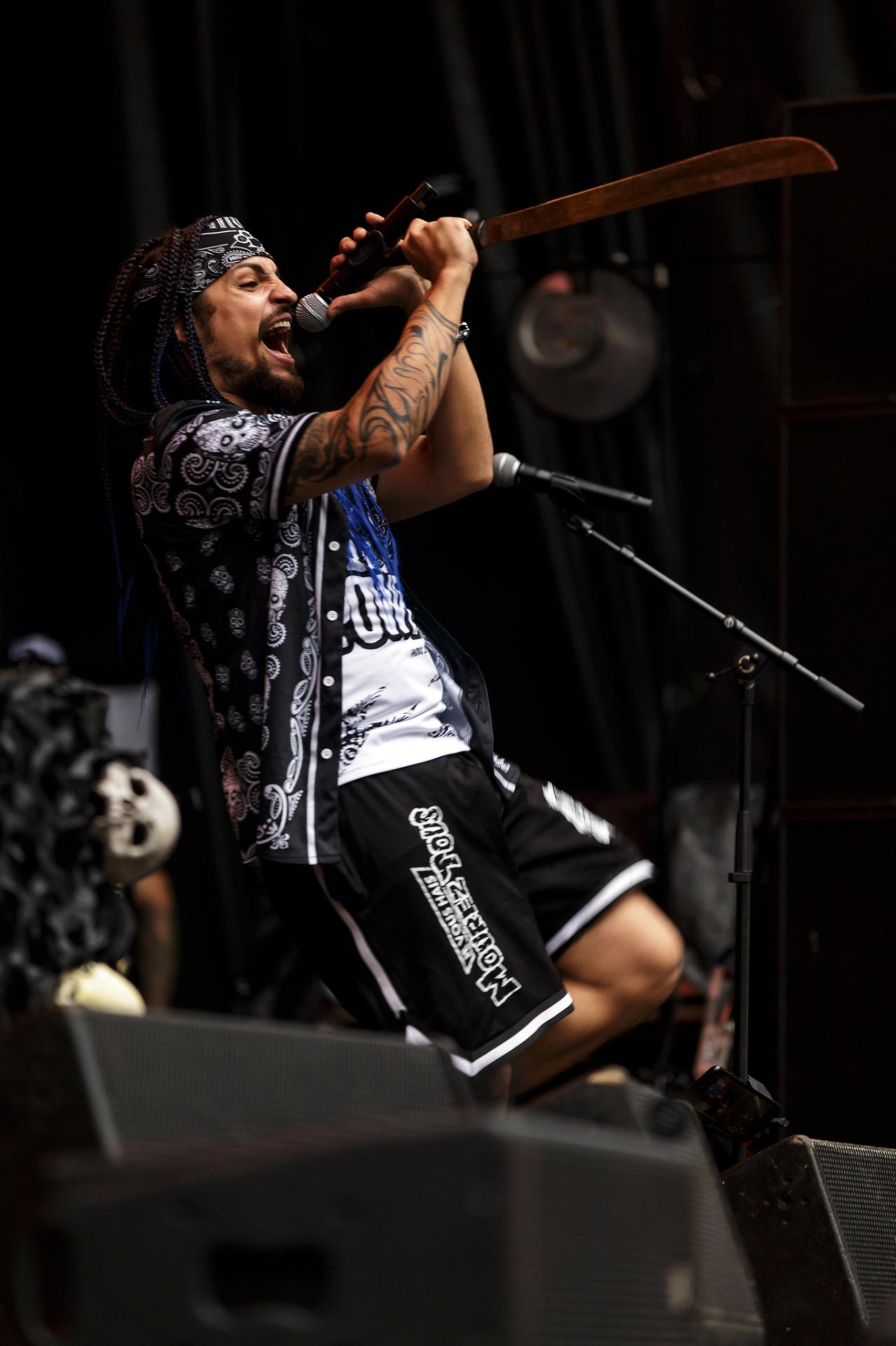 Un peu plus tard, c’est au tour des LOCOMUERTE de venir en découdre. Le groupe, déjà présent à l’édition 2022, ne se fera pas prier pour refaire une prestation qui restera dans les annales du festival. C’est aussi l’occasion pour eux de fêter les 10 ans de leur chanteur El Termito au sein du groupe, un véritable excité du bocal qui ne se contente pas de chanter mais aussi de jouer les casse-cou sur scène entre cascades et cabrioles. Le groupe déglingue tout sur son passage avec son crossover hardcore mêlé à une énergie théâtrale. Leur interaction avec le public, notamment les lâchers de crocodiles gonflables et les performances en espagnol et en français, en font un moment qu’il ne fallait absolument pas rater, d’autant plus que les bandoleros nous offriront quelques extraits de leur nouvel album Parano Booster, un opus qui porte bien son nom puisque chaque moment du set nous booste pour la suite du festival. LOCOMUERTE nous a offert une prestation à la hauteur de sa réputation en mettant littéralement le feu au Parc de Villeroy avec une ambiance "mucho calor!"
