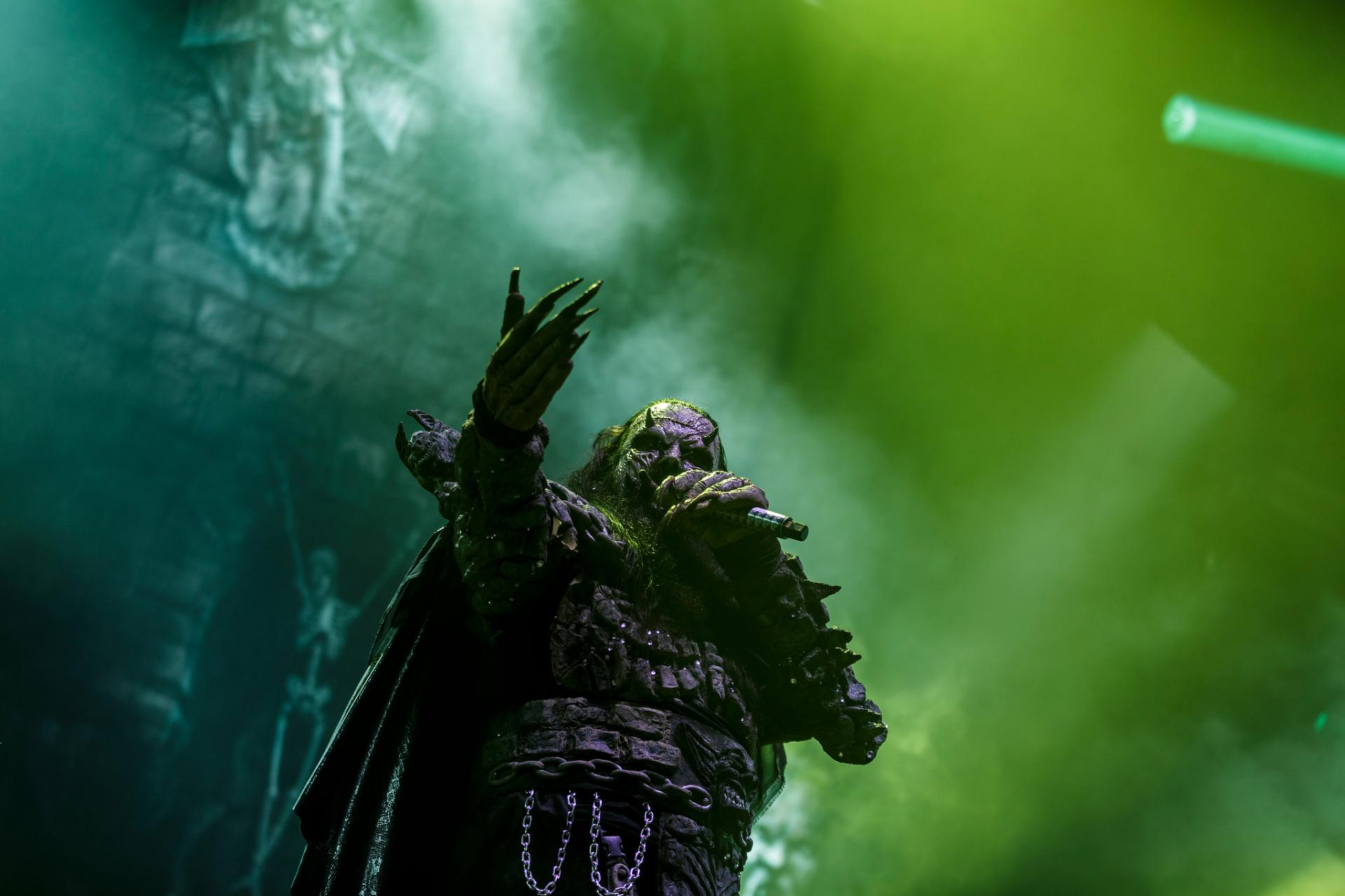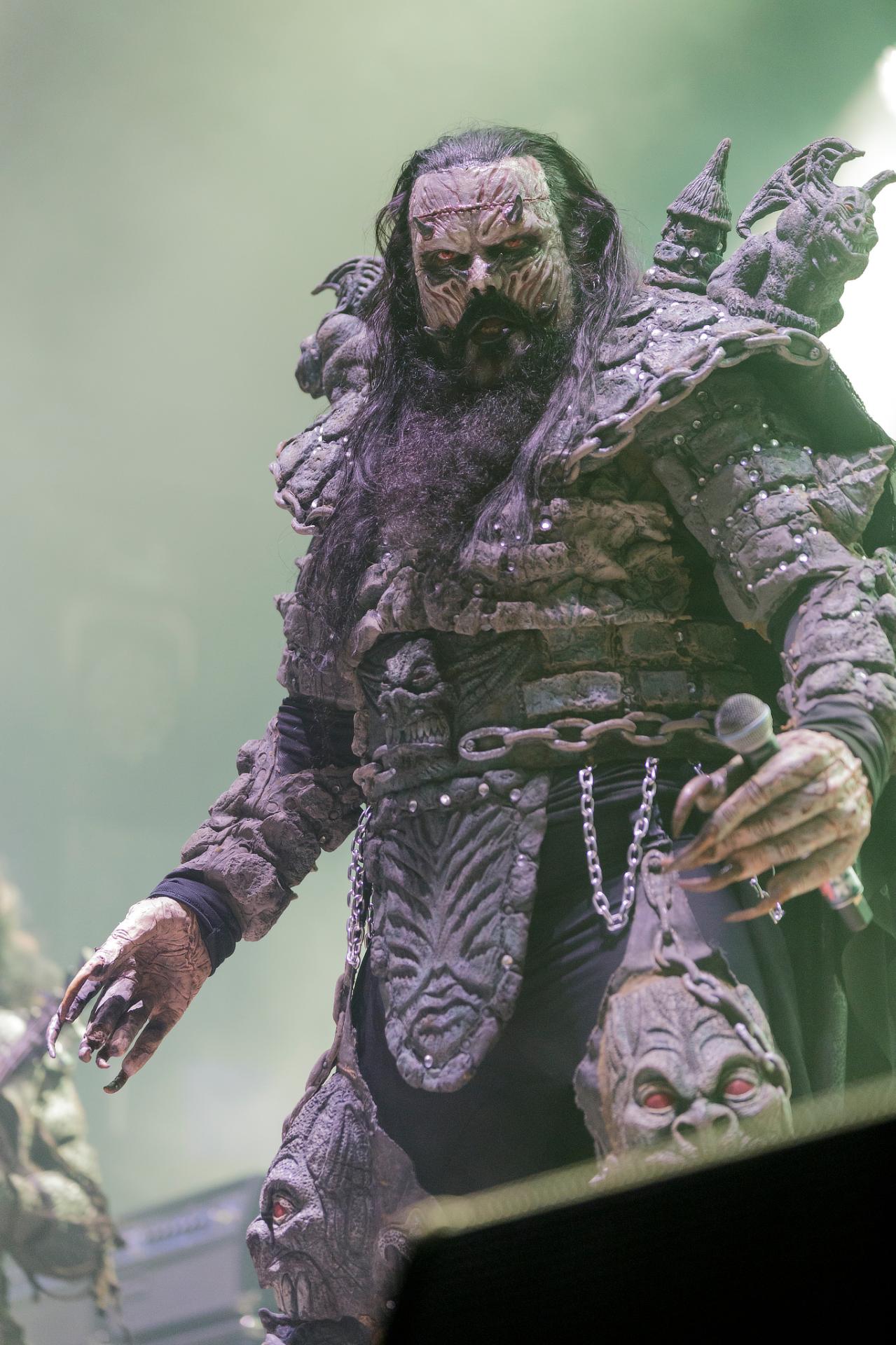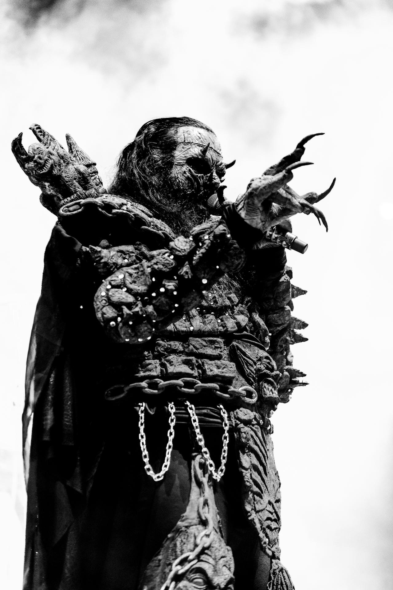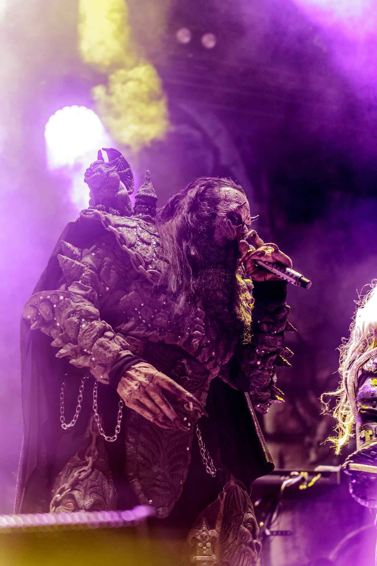 Après une bonne pause, le temps de se restaurer et d’écouter du coin de l’oreille les sets d’OPIUM DU PEUPLE et FATIMA, nous voilà fin prêt pour accueillir sa monstruosité Mr Lordi et ses camarades de LORDI. Cette fois, l’habituel décorum ne sera pas déployé et on notera une légère déception de certains. Alors pour ceux qui ont connu LORDI avec l’Eurovision 2006, le line-up n’a plus rien à avoir avec cette époque révolue puisque seul Mr Lordi (ce qui est logique) est toujours présent depuis. Mais l’âme du groupe subsiste toujours comme on peut le voir avec l’entrée théâtrale de la formation.