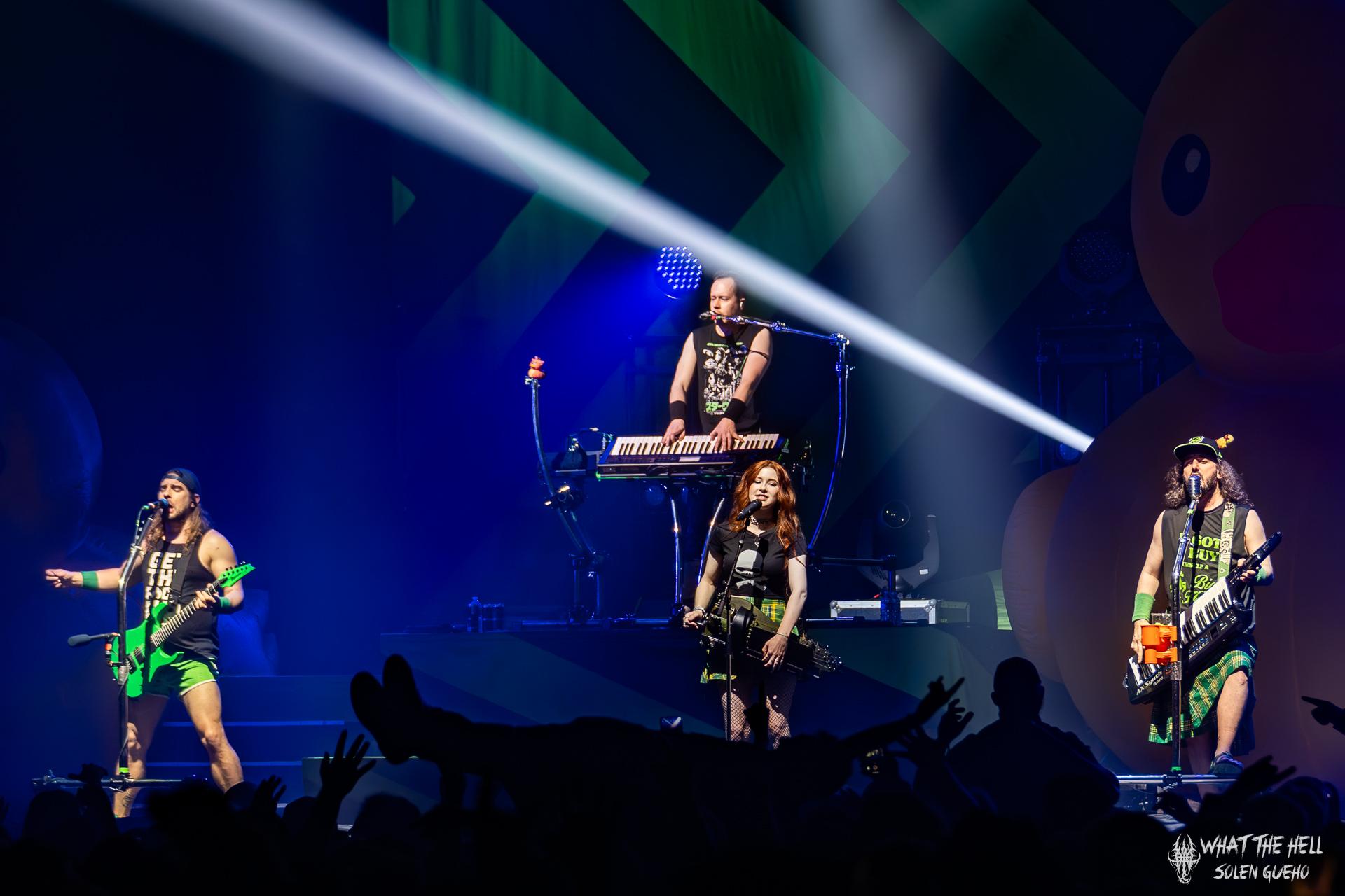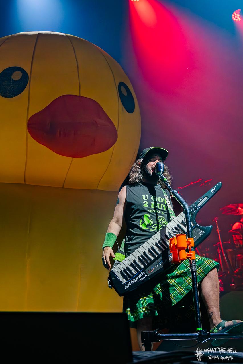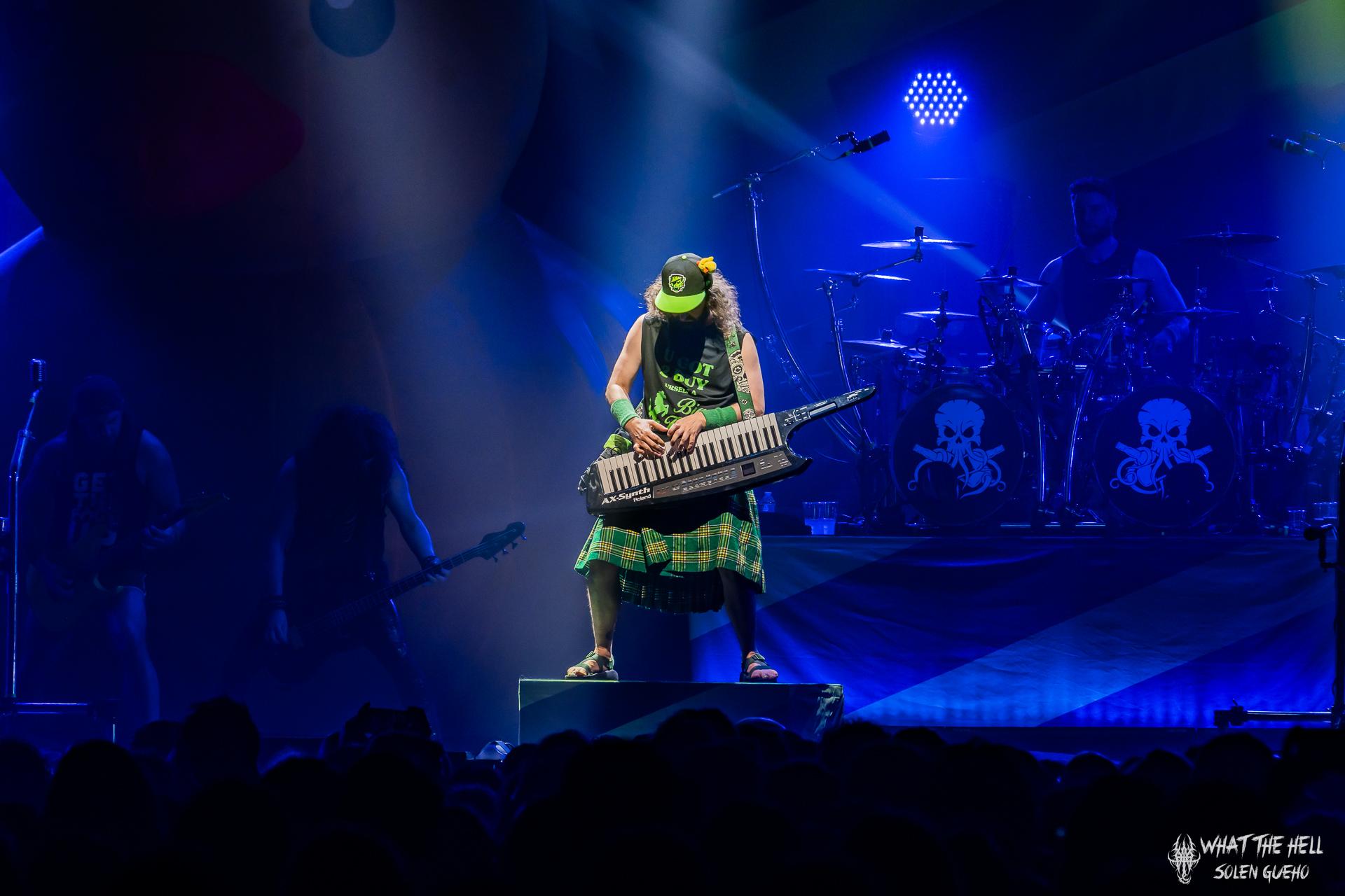Dès leur entrée sur scène, la folie s’empare du Zénith. Christopher Bowes, en capitaine charismatique, harangue la foule tandis que le groupe enchaîne avec Keelhauled, un classique instantanément repris en chœur par le public. Comme à leur habitude, ALESTORM ne fait pas dans la demi-mesure : le décor est un mélange de tonneaux, d’un gigantesque canard gonflable (leur mascotte), et d’un drapeau pirate flottant en fond de scène.