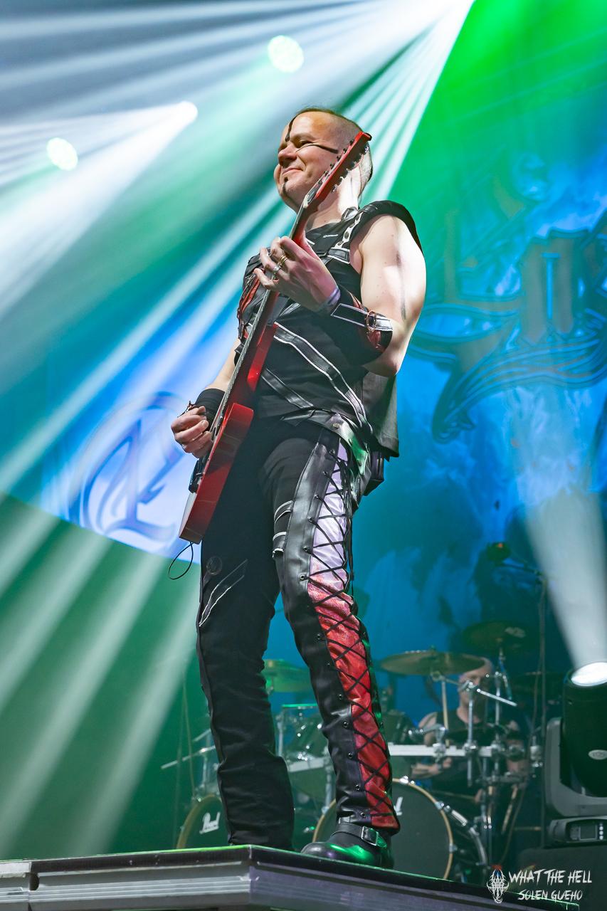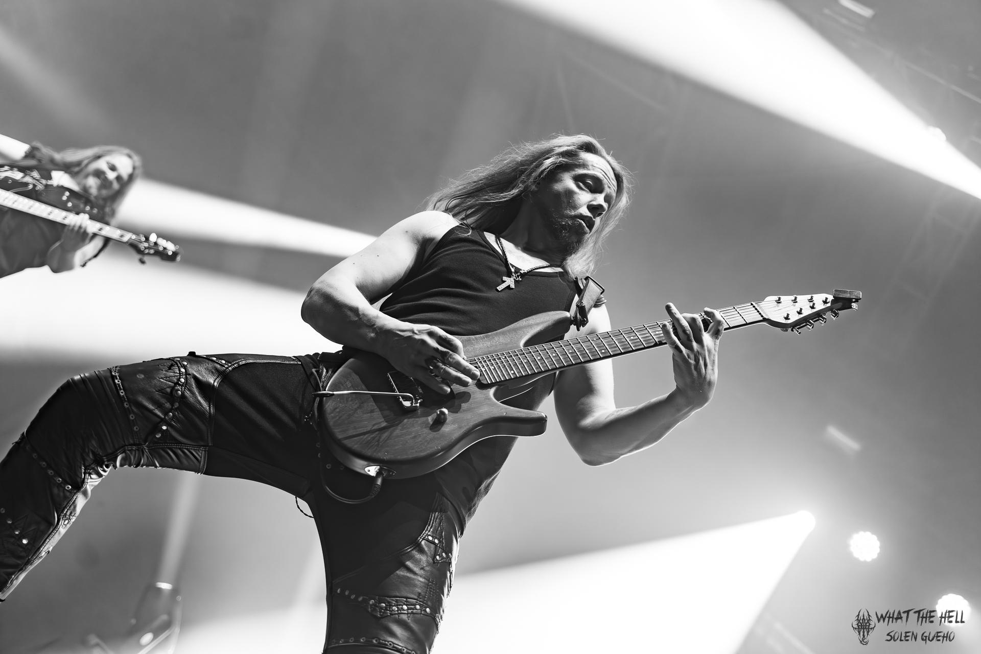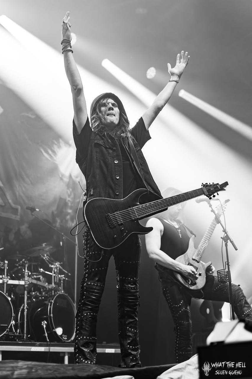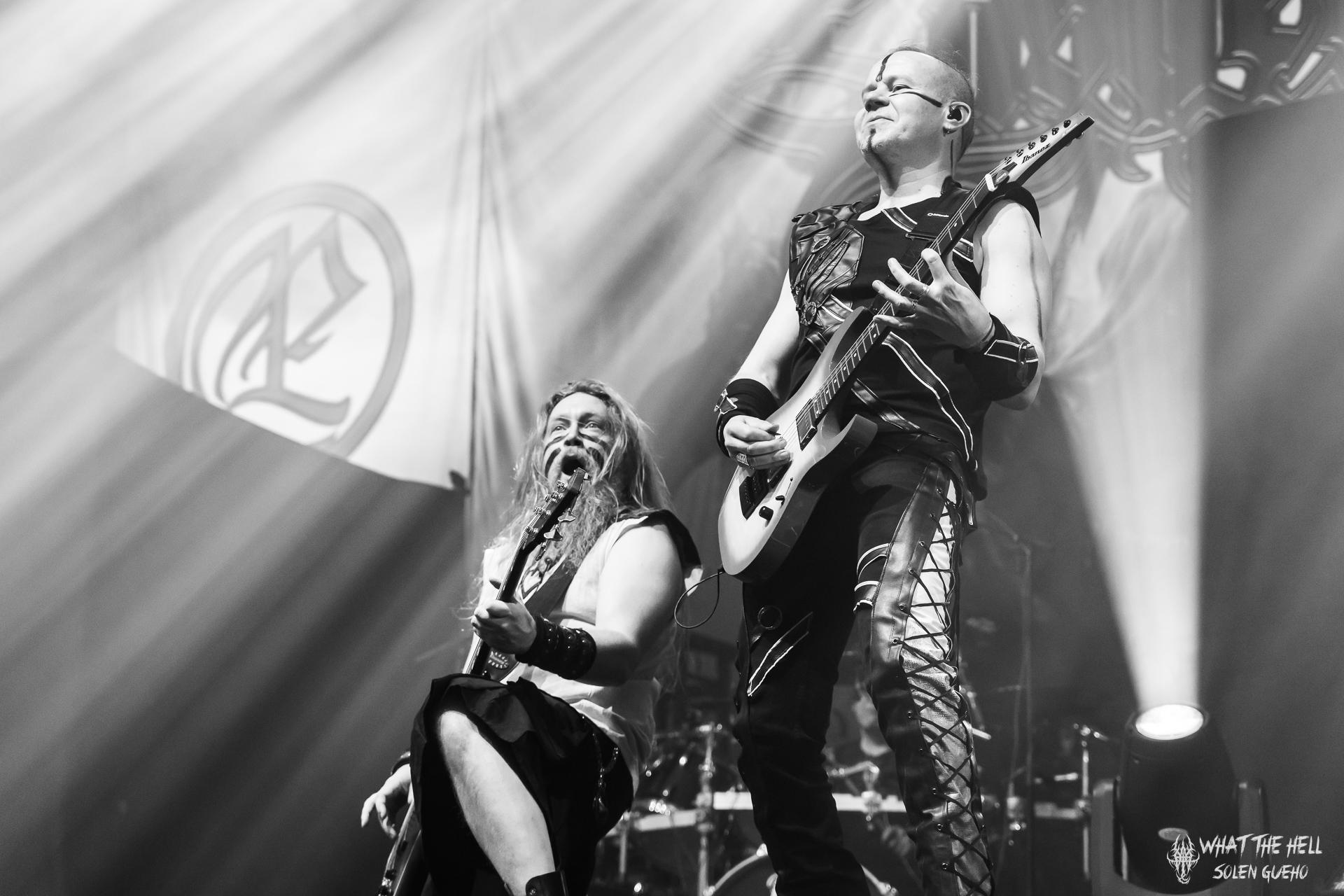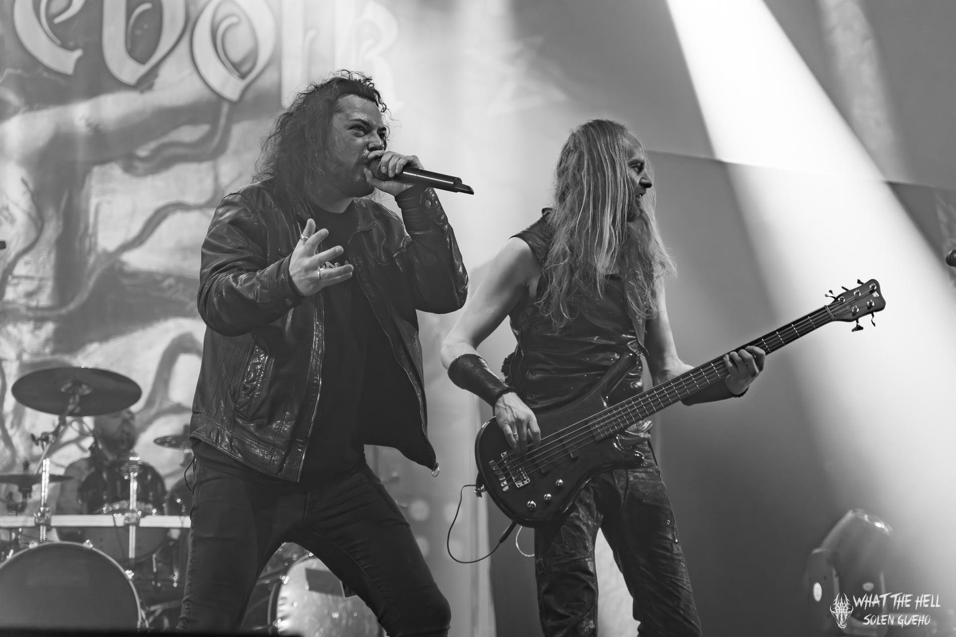 ELVENKING ouvre les hostilités dans un Zénith de Paris peu rempli en raison de l’horaire ; ce seront donc les premiers arrivés qui en profitent. Le set démarre par Throes of Atonement, un titre très épique qui sonne presque comme un générique d’ouverture d’une série médiévale. Le chanteur Damnagoras a fière allure avec ses bois sur la tête. Le deuxième morceau, Pagan Revolution, porte bien son nom pour cette soirée et annonce la couleur pour la suite. Un nouvel album est sur le point d’arrivé et le groupe nous en jouera quelques extraits, dont le nouveau titre Luna. La prestation est énergique et parfaite pour chauffer la salle, qui se remplit au fur et à mesure que les minutes passent. ELVENKING sera bien ovationné ce qui tend à prouver que le groupe a gagné de nouveaux fans et que la prestation a conquis le public.