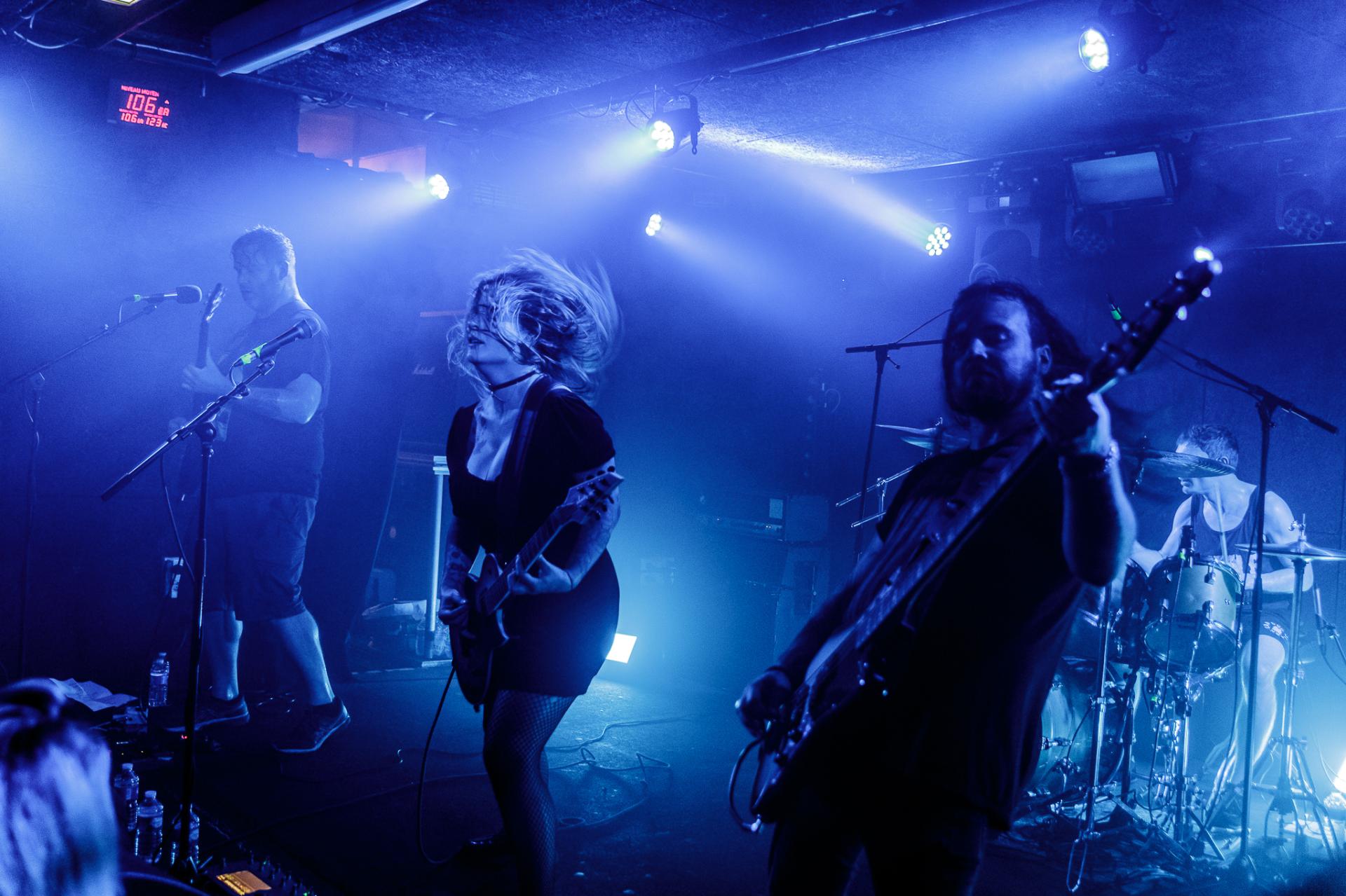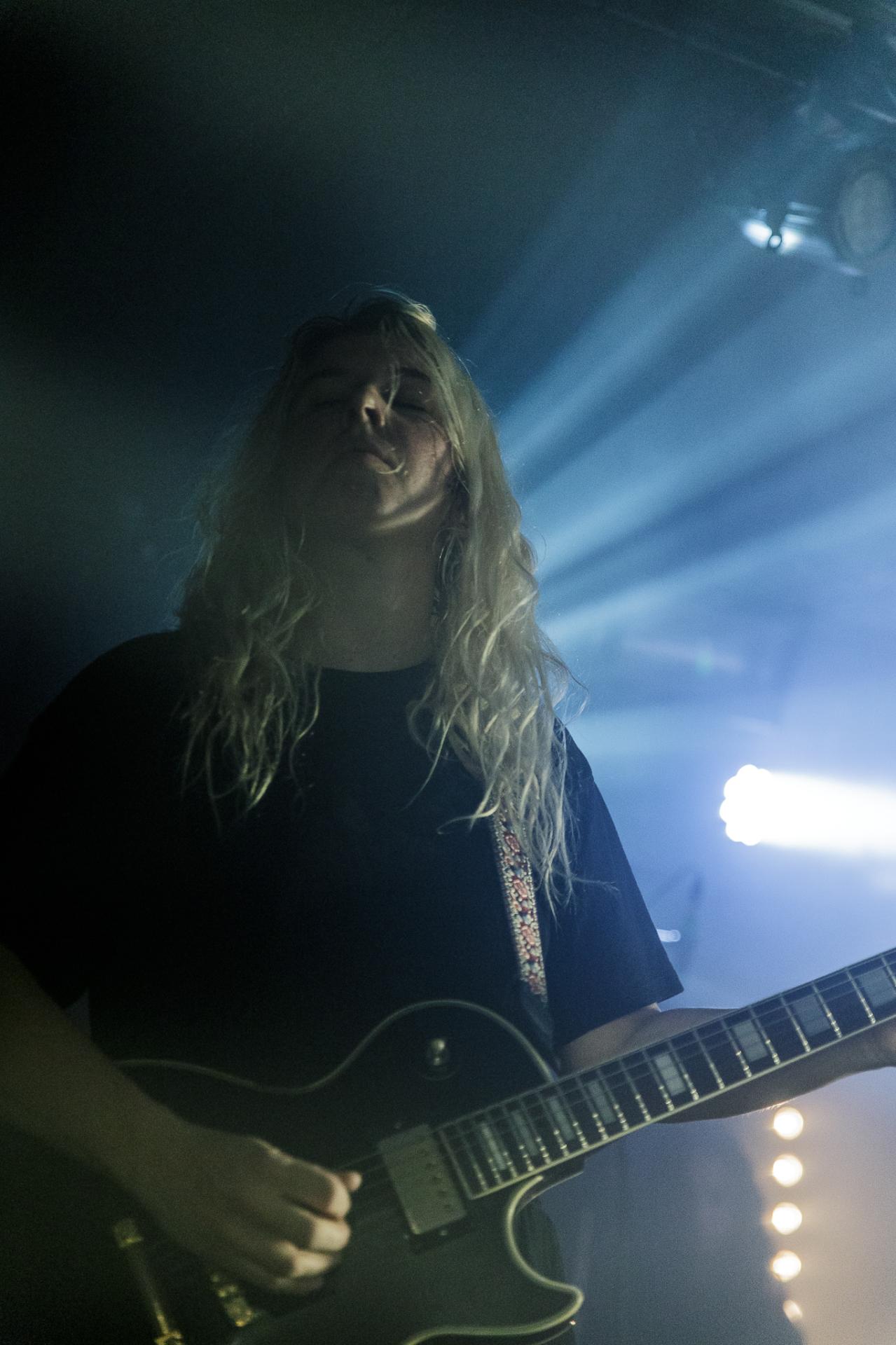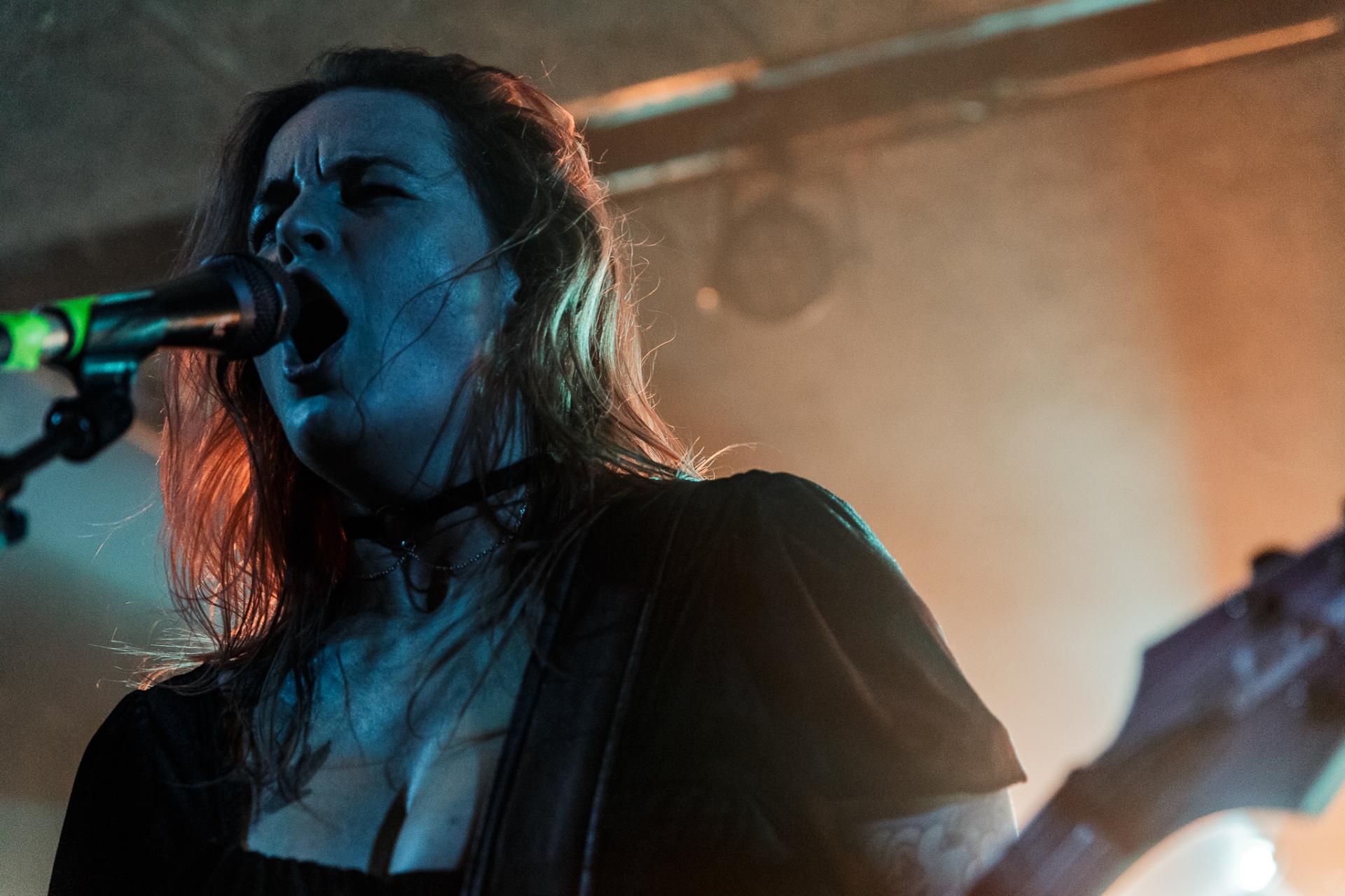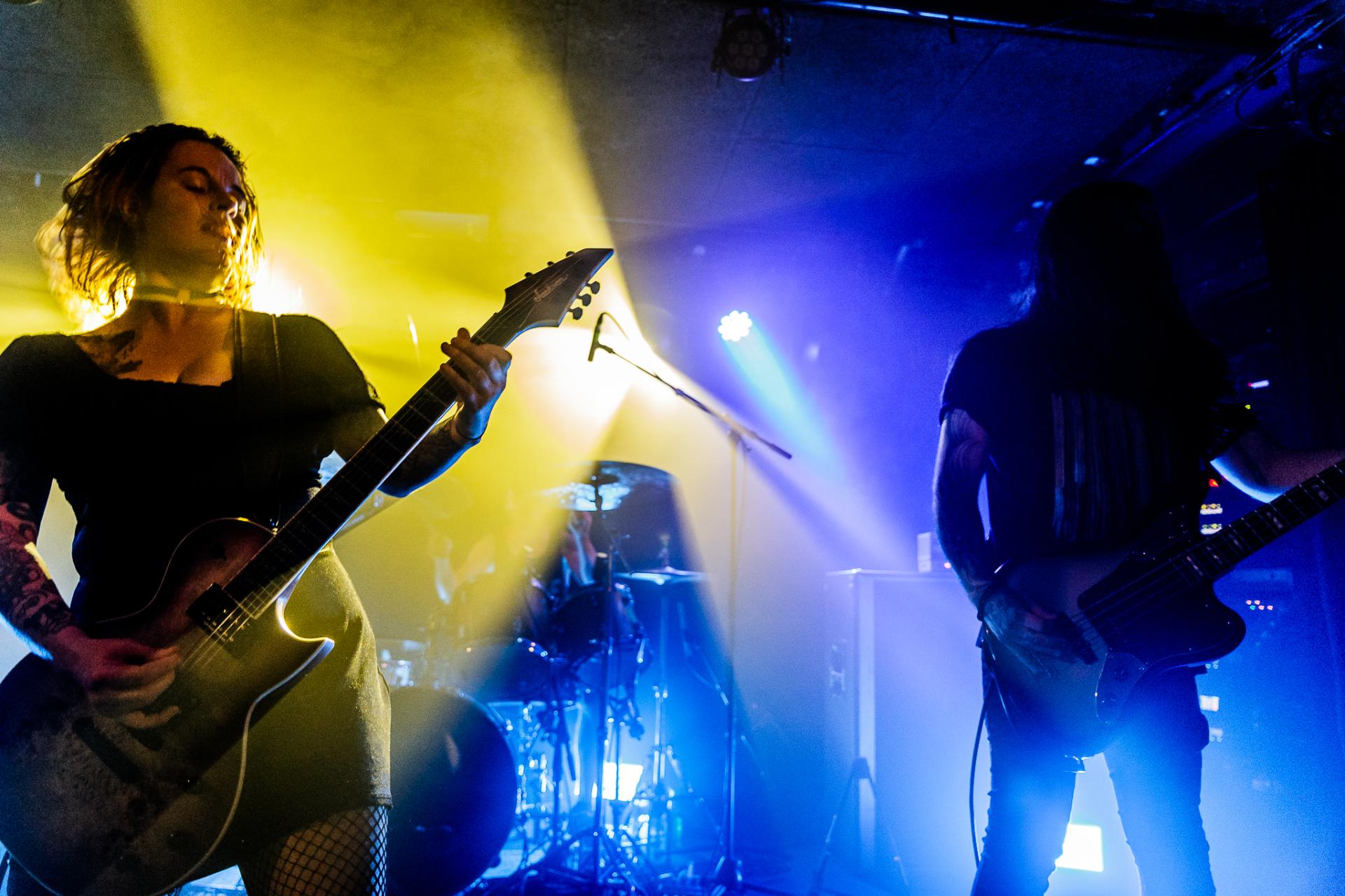 20h45, c’est déjà la tête d’affiche et SVALBARD ne tarde pas à se montrer sur scène sous l’acclamation du public du backstage. La taille de la scène permet toujours cette proximité avec les musiciens. Ceux-ci débutent leur set sur Open Wounds, l’une des pépites de l’album de 2020 When I Die, Will I Get Better ?. Le son en live est beaucoup plus prenant qu’en studio ce qui donne au morceau joué une plus-value. Même facture sur Disparity et ce sera comme ça tout le long du set. Puis vient le moment de présenter leur dernier album The Weight Of The Mask avec Faking It. On apprécie cette façon qu’à le groupe d’envoyer des riffs d’une grande vélocité avec le duo de scream de Serena Cherry et Liam Phelan, tout deux au chant et à la guitare, et de souffler sur des moments de chant clair de Serena, des passages qui nous transportent.