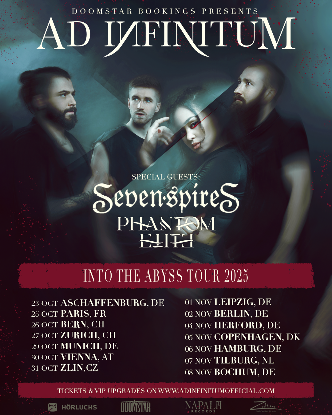 Après avoir terminé une tournée européenne avec les pionniers du Folk Metal ELUVEITIE, AD INFINITUM continue sur sa lancée en annonçant sa première tournée en tête d'affiche pour l'automne 2025 ! Avec SEVEN SPIRES et PHANTOM ELITE en première partie, ce nouveau tour débutera le 23 octobre à Aschaffenburg, en Allemagne (DE), et s'étendra sur 14 villes à travers l'Europe