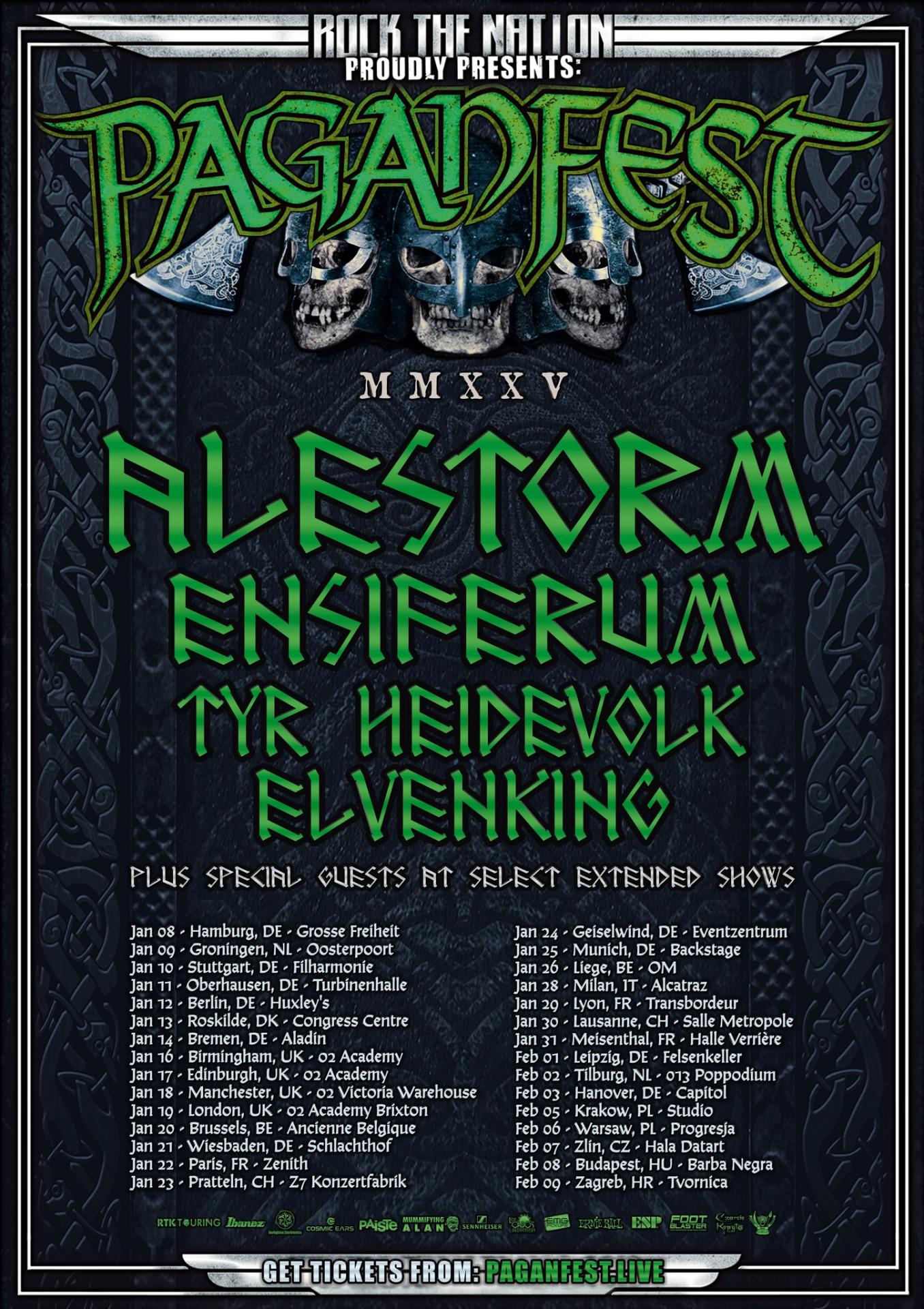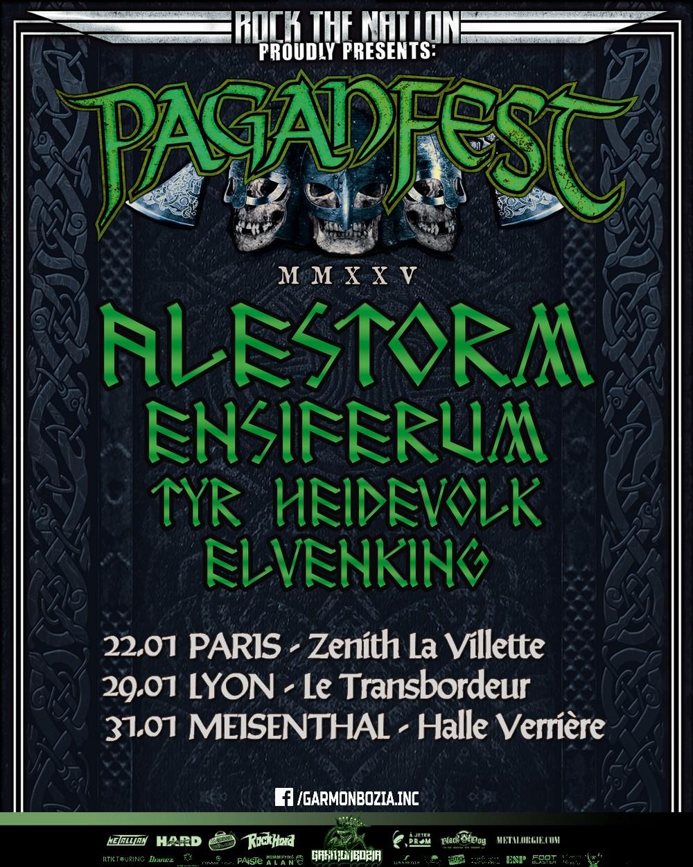 Créé en 2008, le PAGAN FEST est un évènement majeur en Europe et aux Etats Unis, mettant en avant des artistes de la scène Pagan & Folk. Après 10 ans d’absence, 2025 marque le grand retour du PAGAN FEST, avec un line-up inédit : ALESTORM, ENESIFERUM, TÝR, HEIDEVOLK et ELVENKING, soit tout simplement les meilleurs groupes de la scène, réunis pour une grande tournée européenne incluant trois dates en France, dont le 22 janvier 2025 au Zénith de Paris.