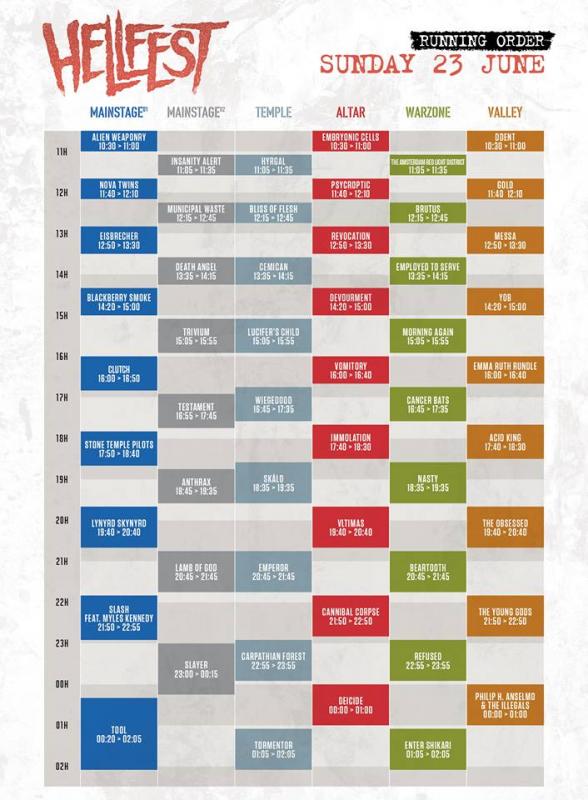 Le Hellfest 2019, qui se tiendra les 21, 22 et 23 juin 2019 à Clisson, a dévoilé le running order du dimanche.