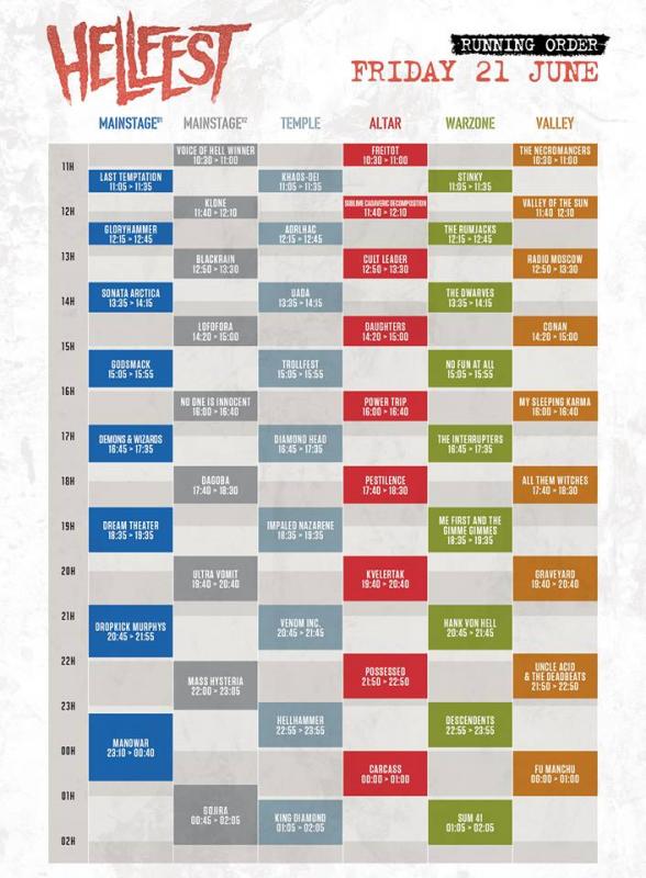 Une fois n'est pas coutume, le Hellfest 2019, qui se tiendra les 21, 22 et 23 juin 2019 à Clisson, a dévoilé le running order du vendredi uniquement. Celui du samedi verra le jour demain à 12h et, suite logique, celui du dimanche sera connu ce dimanche.