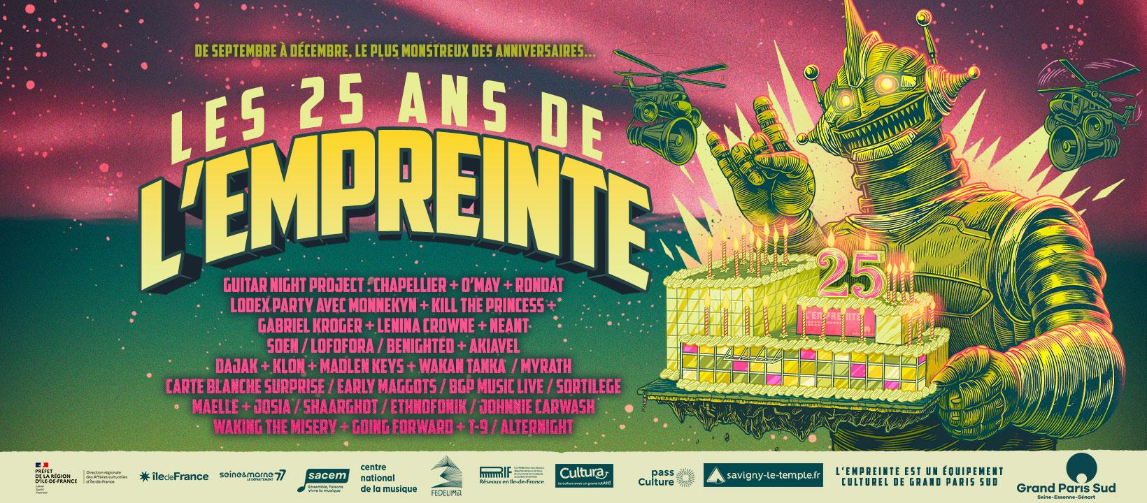 25 ans d’Empreinte c’est aussi : 1 300 groupes amateurs ayant fréquenté nos studios, 5200 musiciennes et musiciens, 252 groupes ayant bénéficié d’un accompagnement artistique et plus de 20 000 publics scolaires accueillis.
